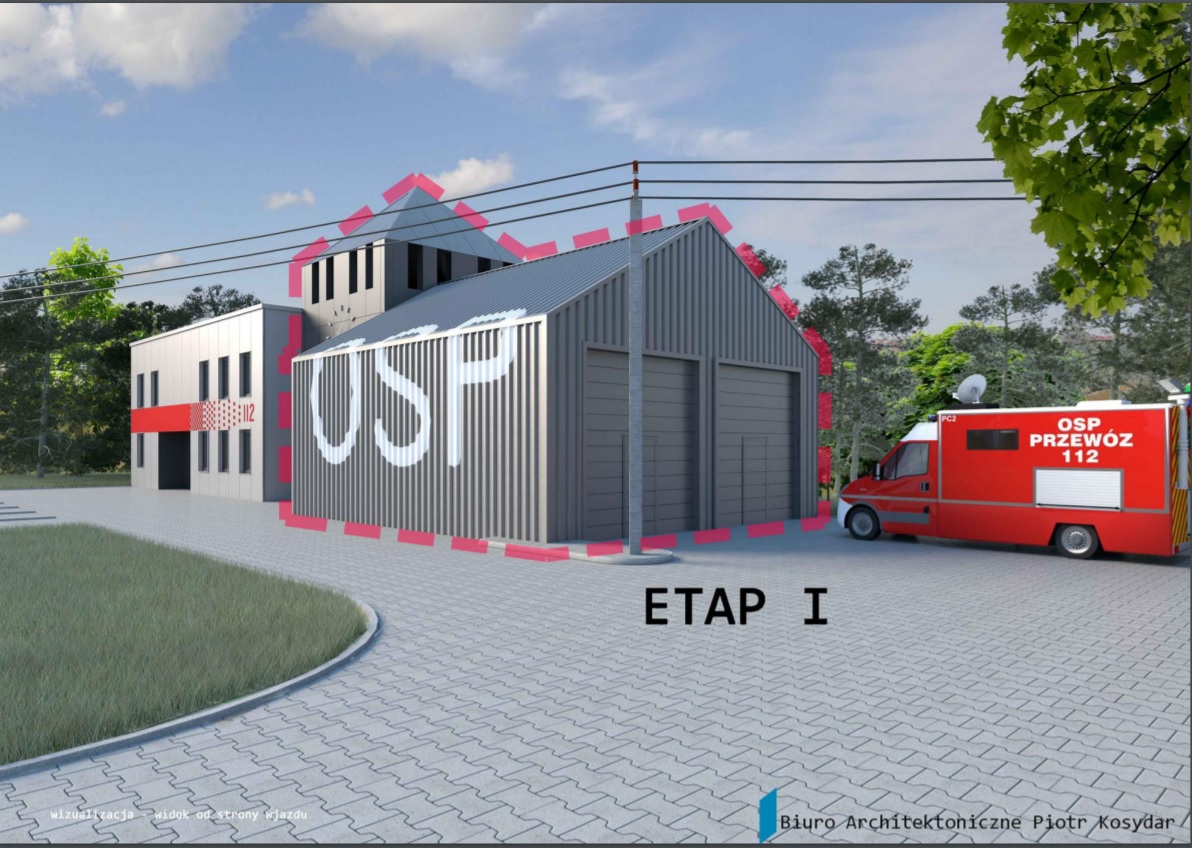 Budowa magazynu sprzętu ratowniczo-gaśniczego i przeciwpowodziowego wraz z garażem na działce OSP Przewóz w Krakowie, która wraz z przygotowaną dokumentacją projektową i pozwoleniem na budowę zostanie przekazana na własność Gminie Kraków.