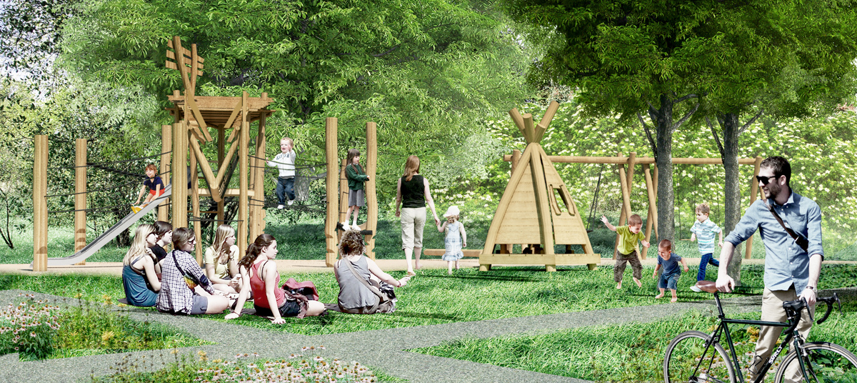 - I strefa usytuowana bliżej centrum handlowego, której głównym elementem jest konstrukcja wspinaczkowa z wieżą widokową w centrum oraz liczne linkami, pomostami oraz siatkami Forma wieżyczki pełni zarówno funkcję zjeżdżalni jak i punktu obserwacyjnego. Elementami uzupełniającymi strefę są domki w kształcie tipi, trasa sprawnościowa, wysokie huśtawki, huśtawki standardowe oraz z siedziskiem gniazdowym, konstrukcja z drewnianych słupów ze stalową poprzeczką, konstrukcja z podwieszonymi obręczami służąca do wspinaczki. W/w wymienione urządzenia wykonane głównie z drewna robinii. Nawierzchnia strefy wykonana z piasku atestowanego