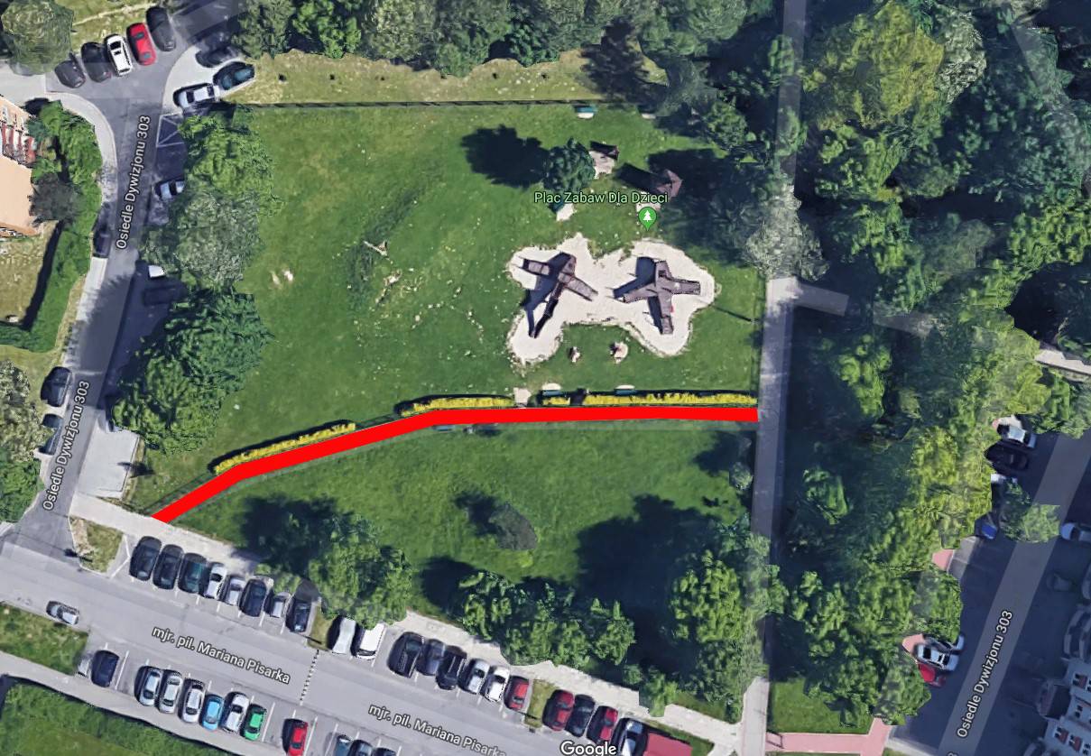 Główna lokalizacja: Działki miejskie: 147/1 i 147/2 ( chodnik miedzy ul. mjr. pil. Mariana Pisarka, a Parkiem imienia gen. Stanisława Skalskiego