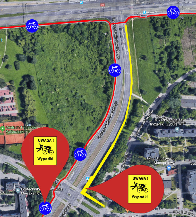 Montaż bariero-siedzisk jest spowodowany koniecznością separacji pieszych od ruchu rowerowego, W tym miejscu dochodzi do wypadków i potraceń pieszych gdzie rowerzyści poruszają się chodnikiem gdzie jest to dopuszczone ze względu na dopuszczoną podwyższoną prędkość na ul. Stella-Sawickiego.