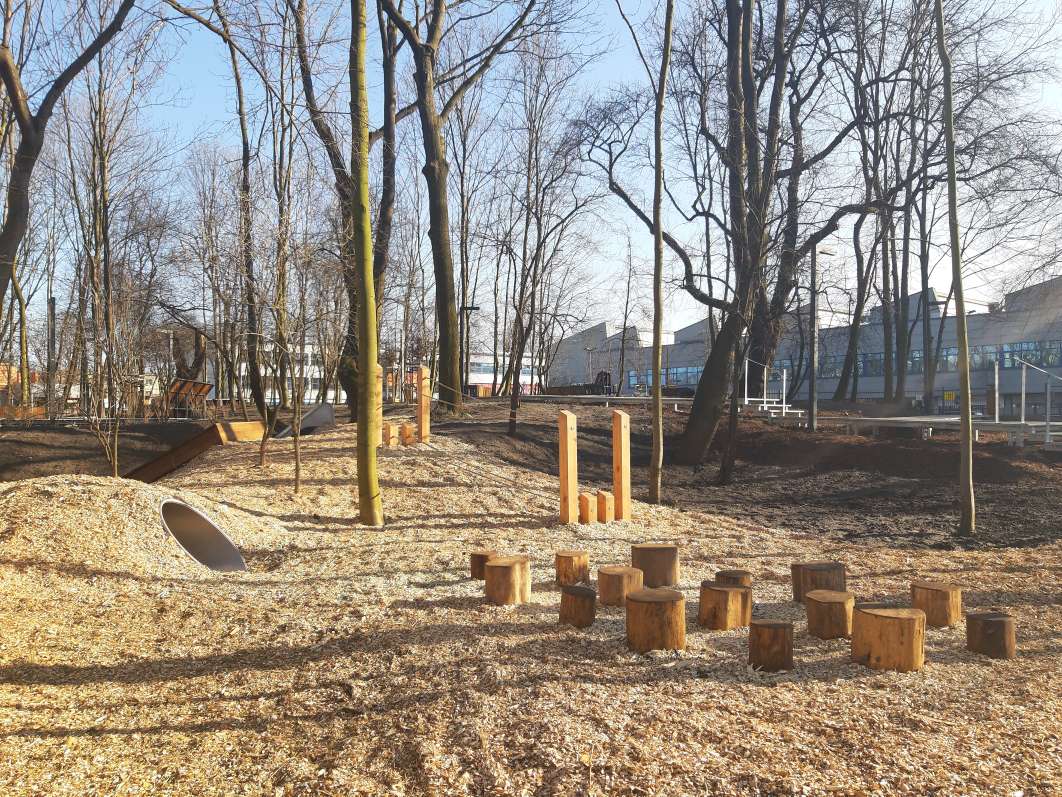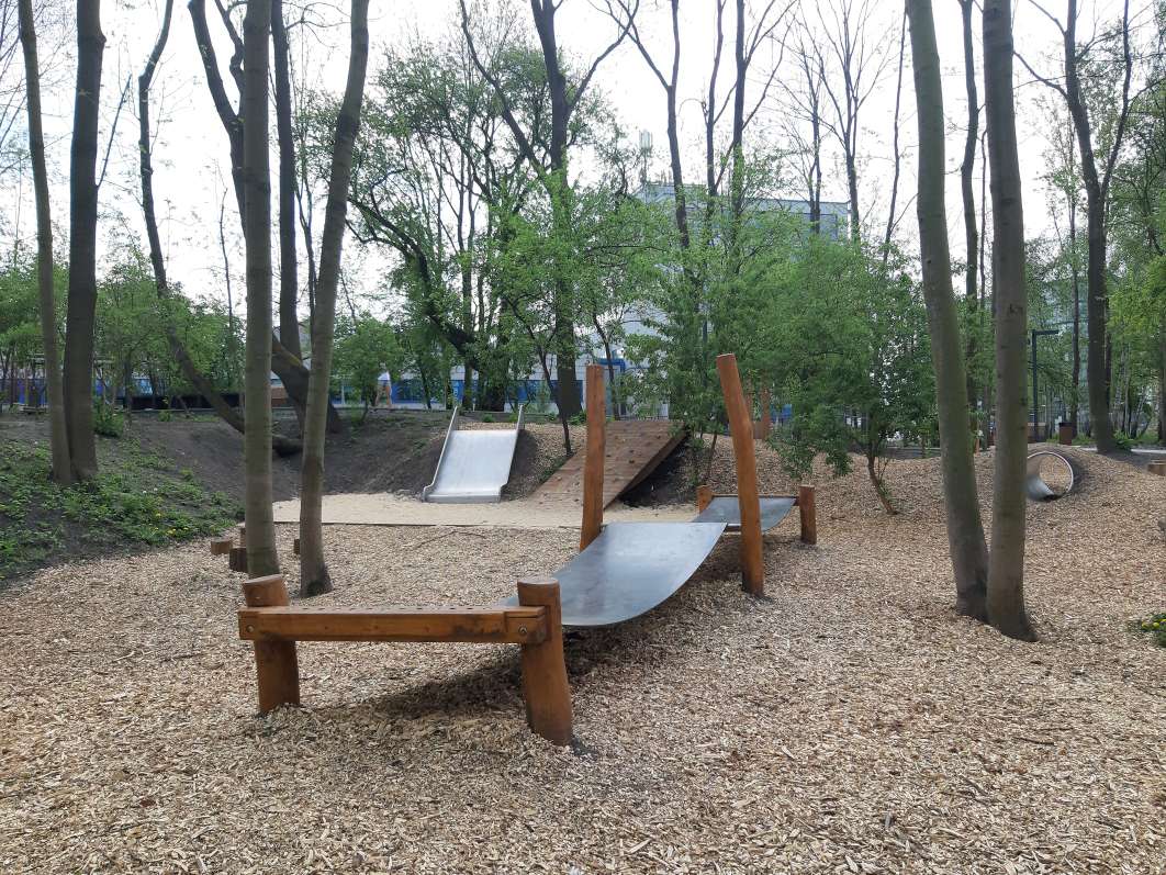 W ramach projektu przewiduje się oczyszczenie tego terenu z samosiewów, na których decyzja wycinkowa nie jest wymagana oraz usunięcie ewentualnych suchych, zagrażających drzew. Powstałe w ten sposób enklawy zieleni zostaną zagospodarowane na leśny plac zabaw. Pojawią się kłody, po których dzieci będą mogły skakać oraz urządzenia niewymagające nawierzchni bezpiecznej jak np. tor przeszkód, pieńki do skakania, szlak zręcznościowy, które poprawią sprawność ruchową dzieci i pobudzą wyobraźnię. W miarę możliwości, ze względu na konieczność zachowania wskaźnik terenu biologicznie czynnego pojawią się naturalne nawierzchnie.