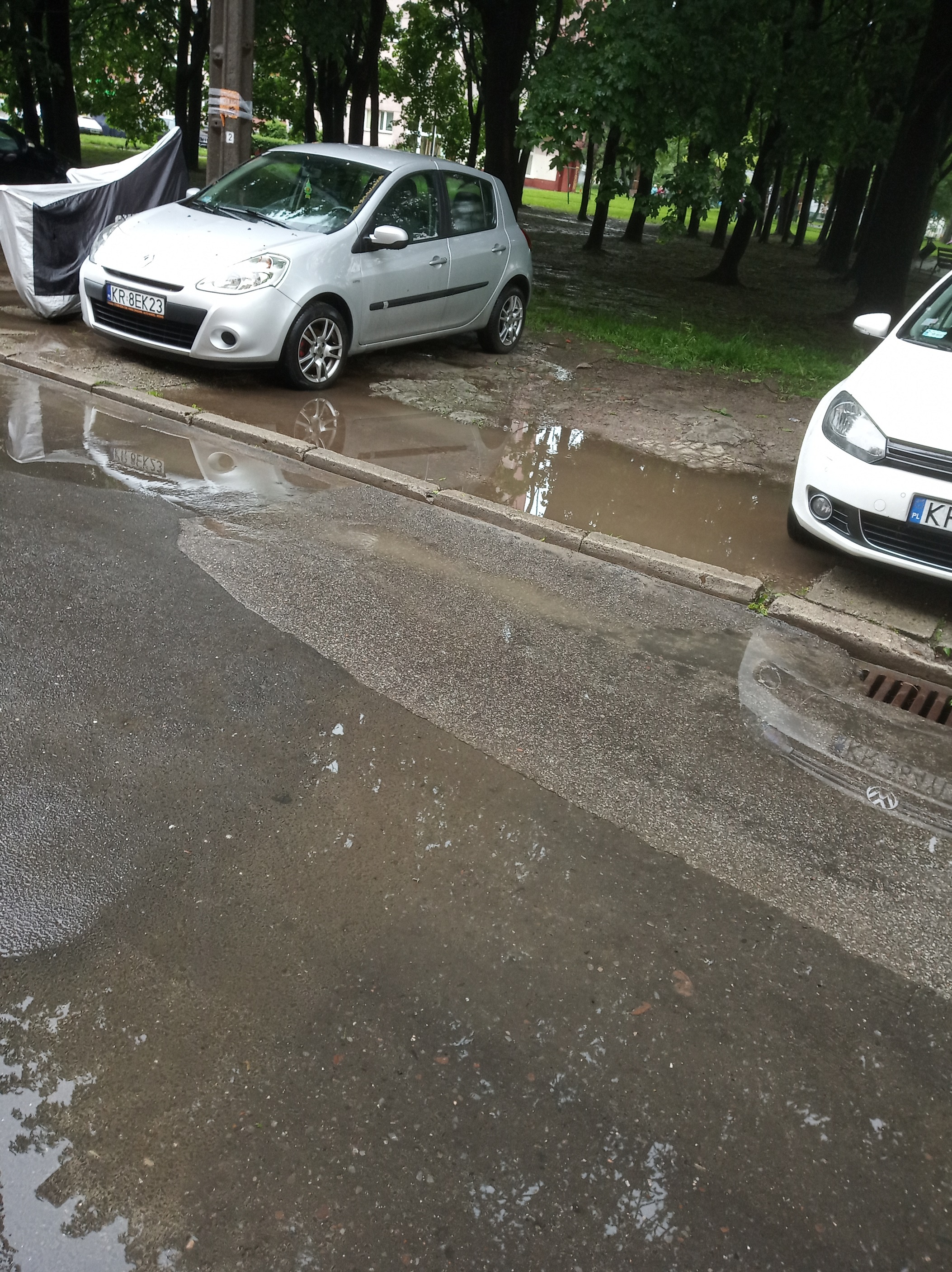 Uliczka przebiegająca bliżej bloku jest bardzo wąska, dodatkowo parkują równolegle do bloku samochody