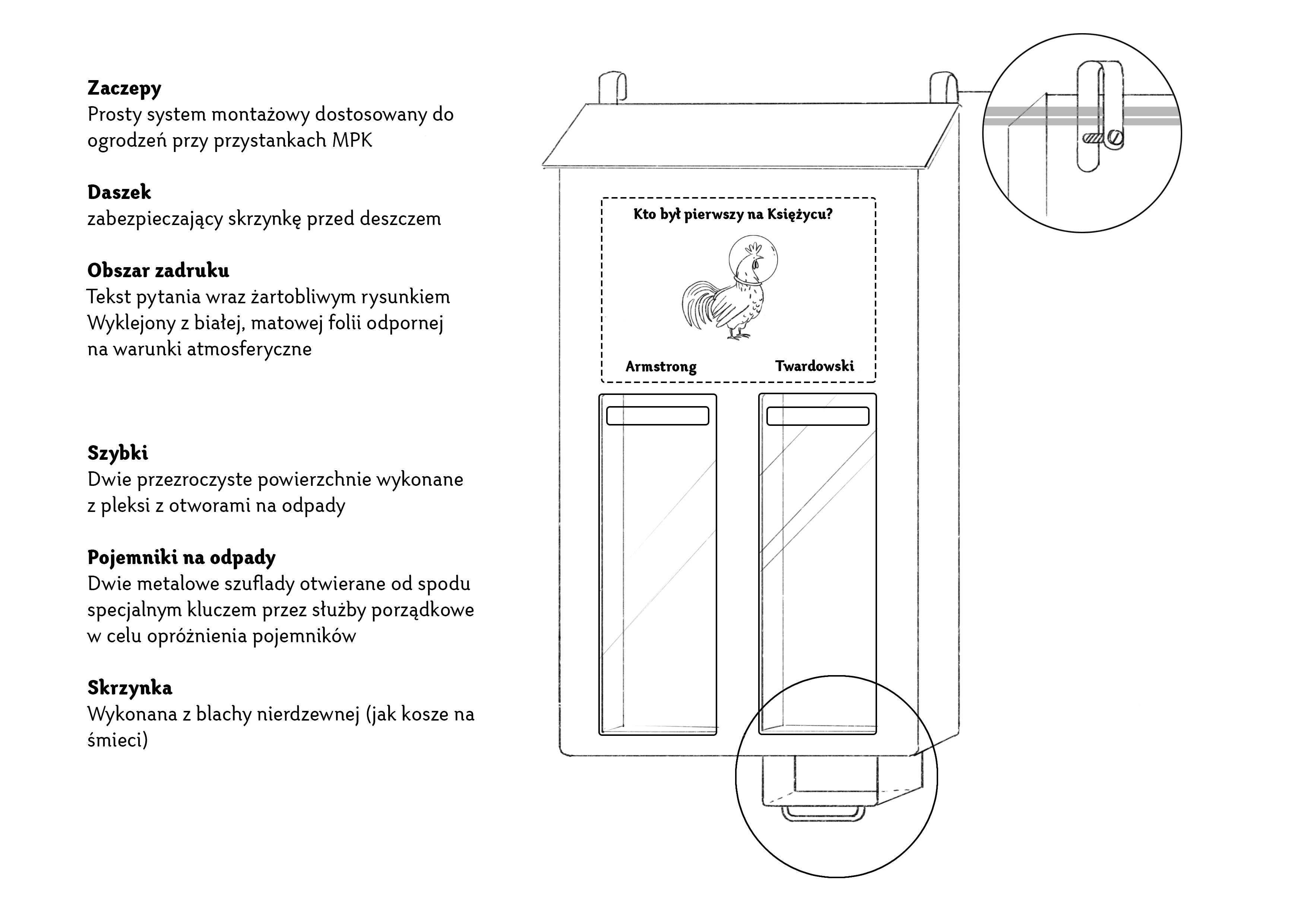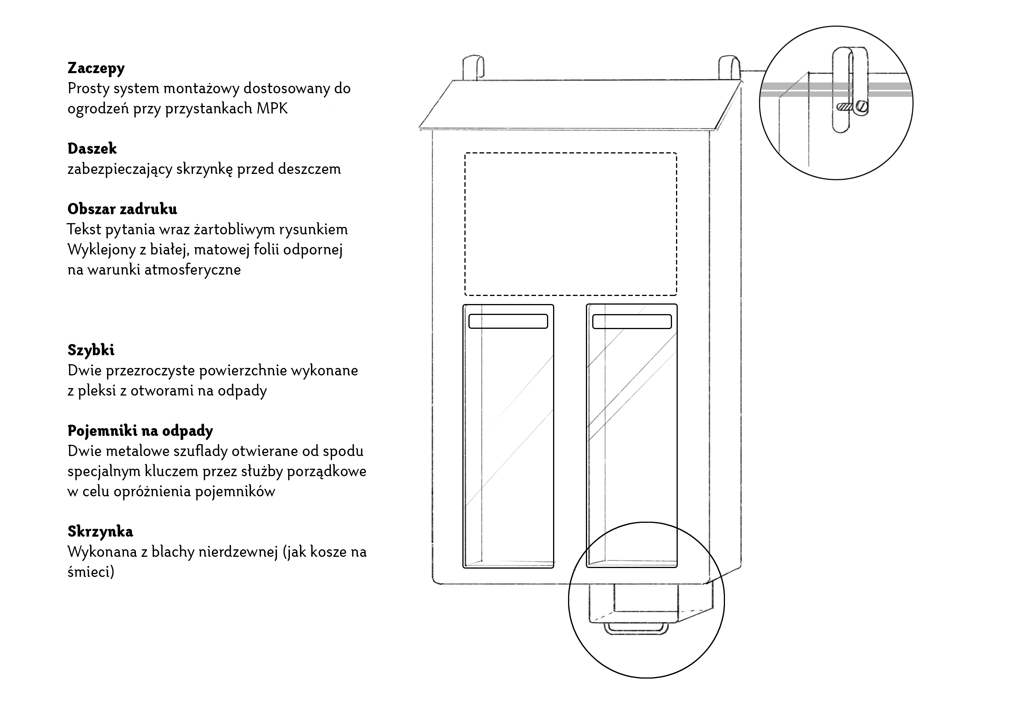 Pojemnik na niedopałki wykonany będzie ze stali nierdzewnej (jak kosze na śmieci). Dwie metalowe szuflady otwierane od spodu specjalnym kluczem będą opróżniane przez służby porządkowe. Szybki wykonane z pleksi będą mieć otwory, przez które będzie można wrzucać niedopałki. Pojemnik zabezpieczony zostanie przed deszczem daszkiem. Tekst pytania wraz z żartobliwym rysunkiem zostanie wyklejony z białej, matowej folii odpornej na warunki atmosferyczne. Całość łatwo będzie można zaczepić na ogrodzeniu przystanku komunikacji miejskiej (w przypadku przystanków tramwajowych) lub zamontować na słupku (w przypadku przystanków autobusowych).