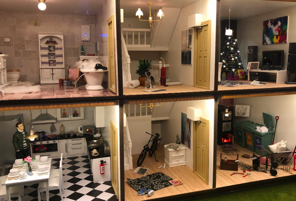 - Budynek wykonano w skali 1:12, posiada 6 pomieszczeń na 3 kondygnacjach.