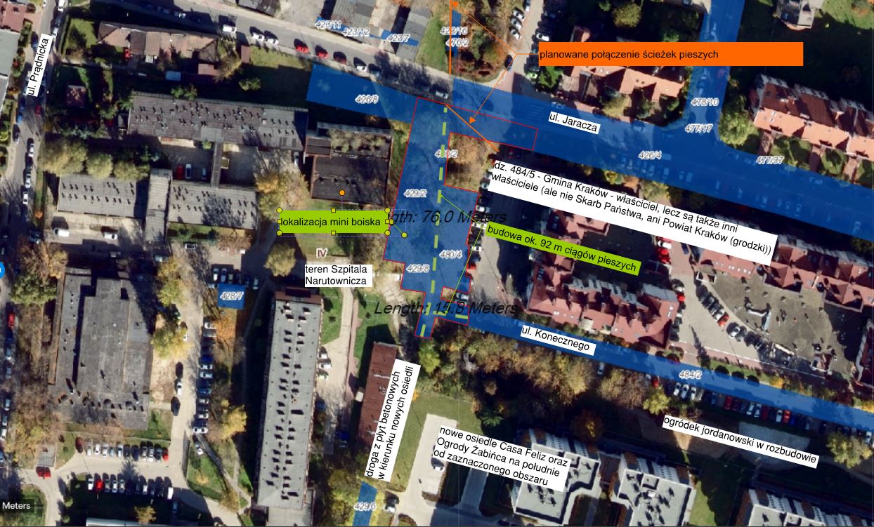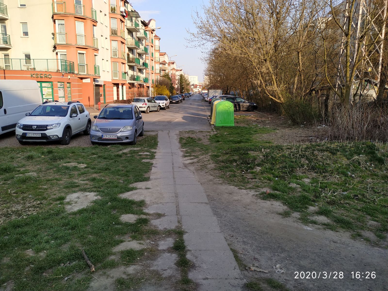 Osiedle Żabiniec stanowi na mapie Krakowa teren bardzo mocno zurbanizowany z deficytem miejsc zielonych urządzonych. Wnioskowany teren chodź nieurządzony stanowi w pobliskim obszarze zalążek skweru z zielenią której brakuje w okolicy. Stanowi również trakt pieszy nieutwardzony z poblikich osiedli w kierunku przystanków komunikacji miejskiej. Podczas opadów deszczu przejście nim jest utrudnione. Na terenie znajduje się również zarośnięte już gruzowisko i pozostałości po betonowych słupach oświetleniowych. Rewitalizacja terenu oddałaby mieszkańcom dodatkowy skwer z zielenią, wygodne, bezpieczne i oświetlone alejki piesze jak i małych wymiarów boisko dla najmłodszych na którym najmłodsza społeczność Żabińca mogłaby rozwijać swoje umiejętności co stanowiłoby uzupełnienie ogródka jordanowskiego przy ul. Konecznego oraz poprawiłoby jakość siatki połączeń pieszych w kierunku przystanków komunikacji miejskiej.