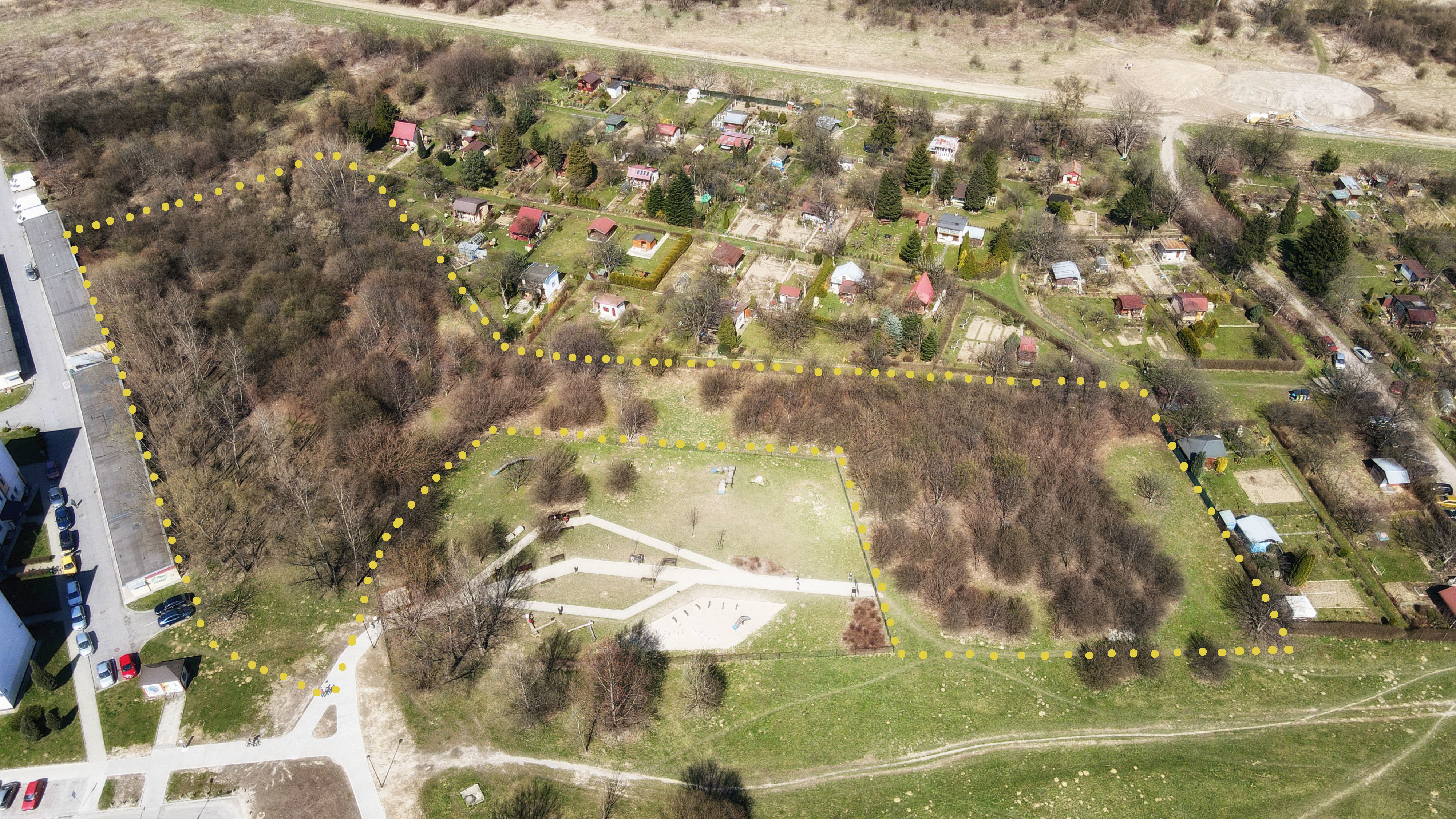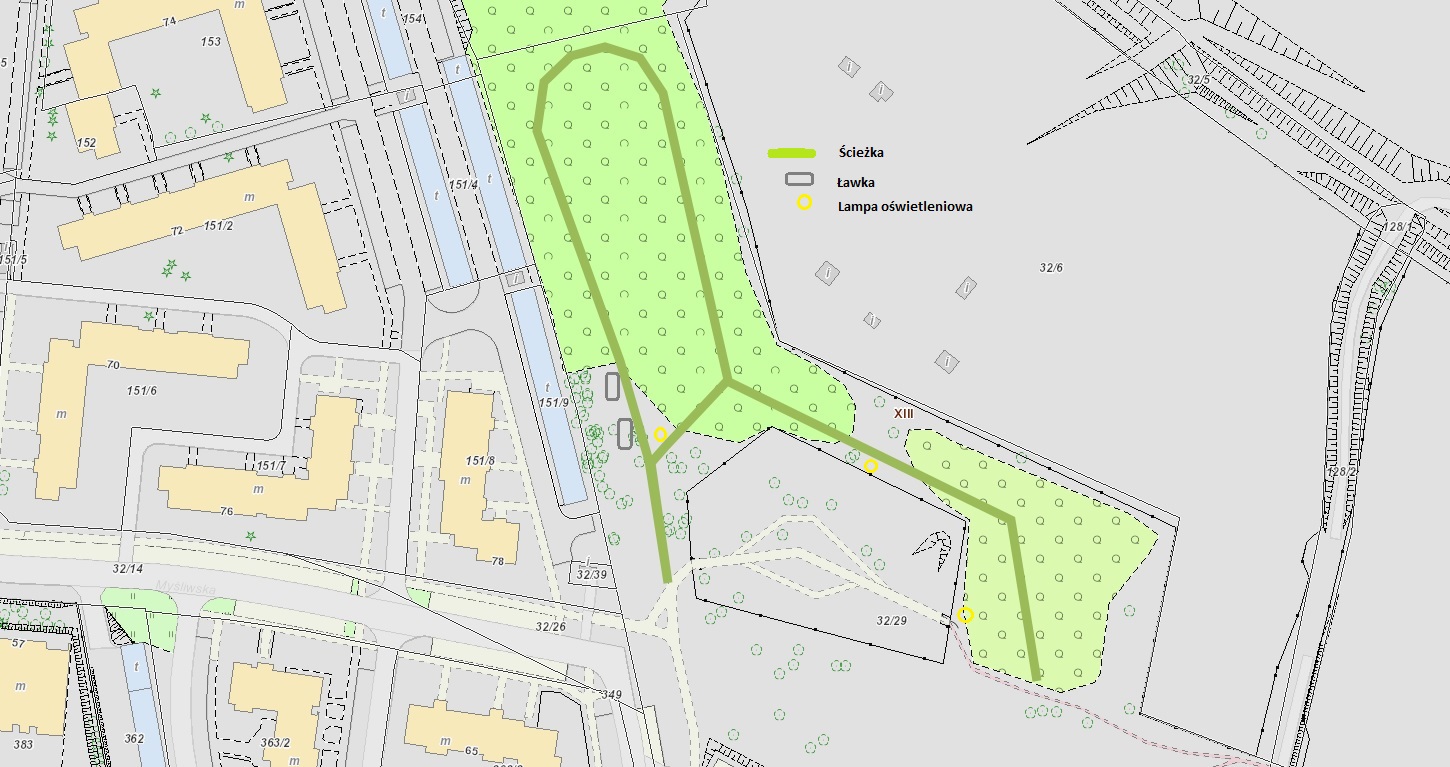 Główna lokalizacja: Teren zielony przy zbiegu ulic Myśliwska i Lipska. Północna część działki nr 32/29, obr. 18 Podgórze w okolicy istniejącego psiego wybiegu, aż do północnego krańca działki miejskiej