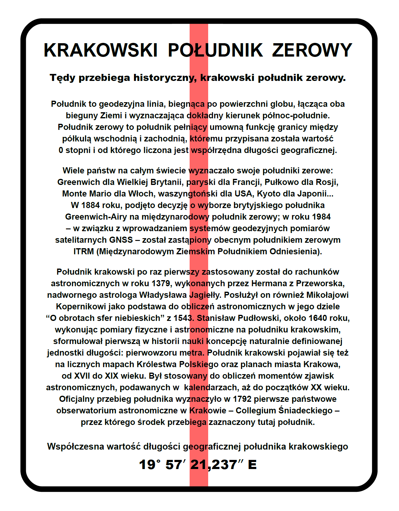 KRAKOWSKI POŁUDNIK ZEROWY to wyjątkowy obiekt geograficzny, z niezwykłą historią. Jest to linia geodezyjna, wyznaczająca dokładny kierunek północ-południe. To polski odpowiednik słynnych południków Greenwich czy Paryskiego; popularnych atrakcji edukacyjnych Anglii i Francji. Nasz, południk krakowski, istnieje już od końca XIV wieku, służył Mikołajowi Kopernikowi do obliczeń astronomicznych, które zamieścił w swoim dziele "O obrotach sfer niebieskich", dowodząc, że Ziemia krąży wokół Słońca. Z tym południkim wiąże się też postać fizyka i astronomia, Stanisława Pudłowskiego, który jako pierwszy wymyślił naturalną jednostkę długości: metr - na 150 lat przez metrem paryskim. Południk krakowski pojawiał się przez stulecia na wielu mapach, planach i w pracach naukowych z dziedziny astronomii. Jest to więc bardzo ważny obiekt o historii, którą należy popularyzować. A szkoła jest najlepszym do tego miejscem.