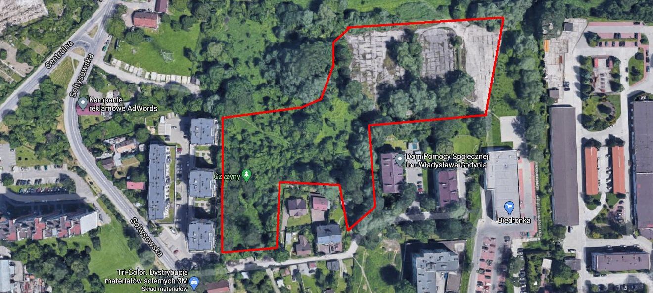 Projekt zakłada realizację terenów zieleni urządzonej na działkach miejskich w Czyżynach w pobliżu skrzyżowania ul. Centralnej z ul. Sołtysowską.