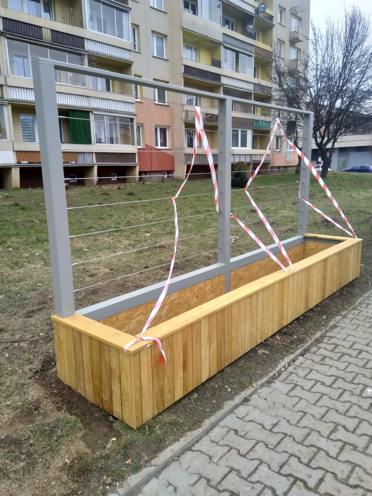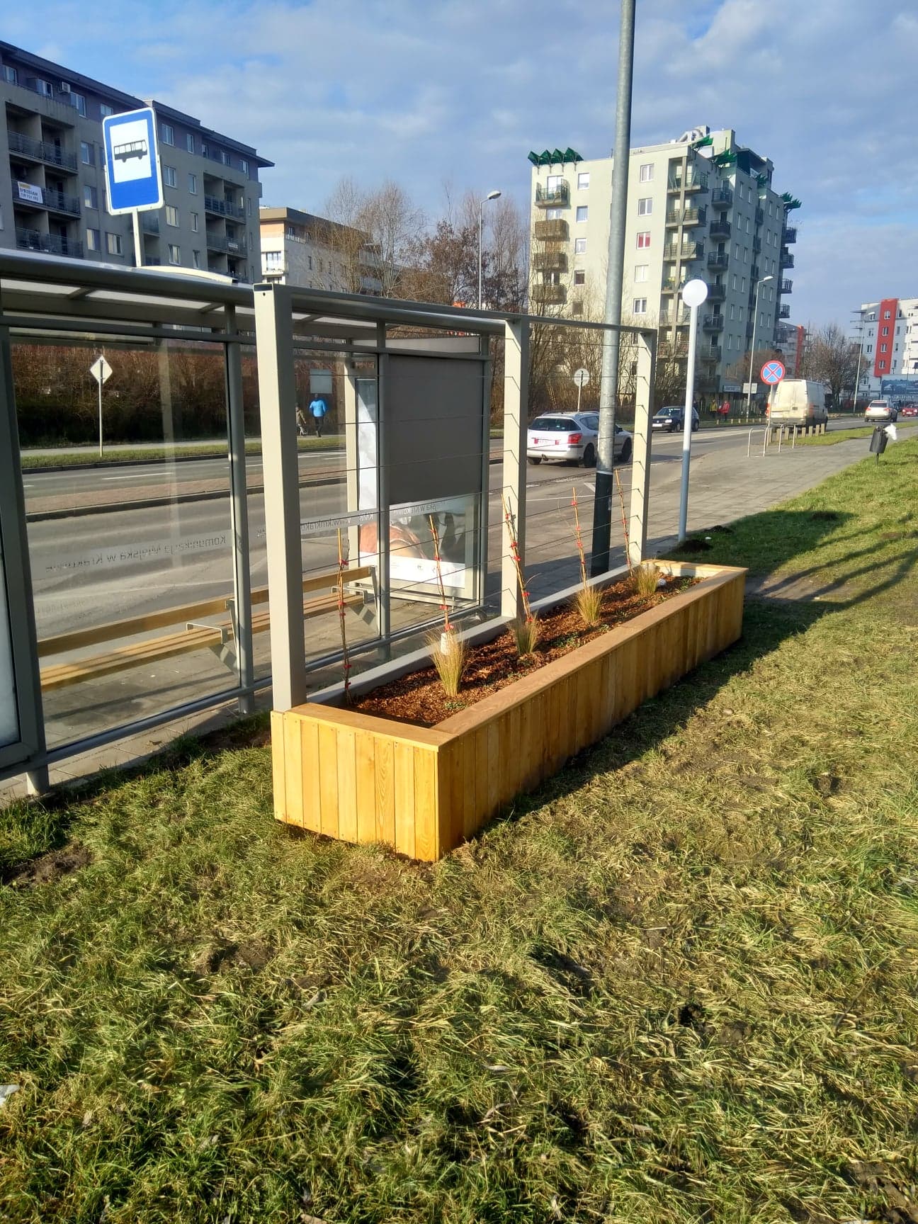 Projekt zakłada montaż przy przystankach donic ze specjalnym stelażem dla roślin pnących.