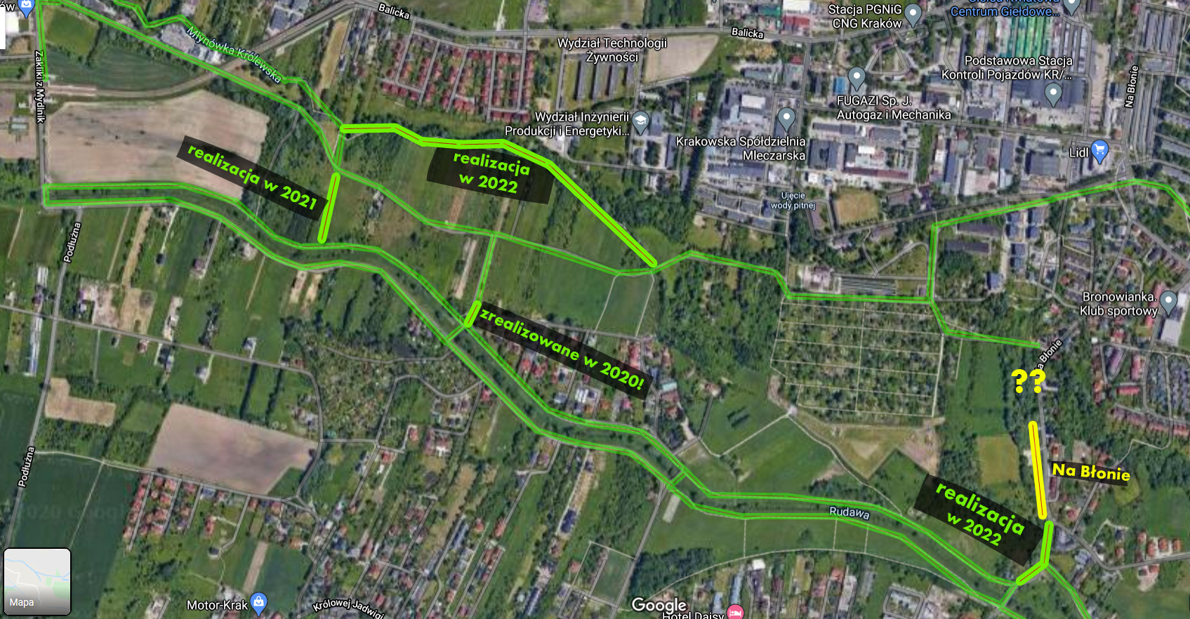 Aktualnie trwają prace związane z opracowaniem wielowariantowej i wielobranżowej koncepcji budowy Trasy Balickiej. W czterech, z pięciu wariantów koncepcji,została ujęta przebudowa części ulicy Na Błonie, która pokrywa się z odcinkiem ulicy, wzdłuż której zaproponowano budowę chodnika.Istnieje duże ryzyko,że przy realizacji Trasy Balickiej zaistniałaby konieczność przebudowy chodnika wnioskowanego w projekcie BO.