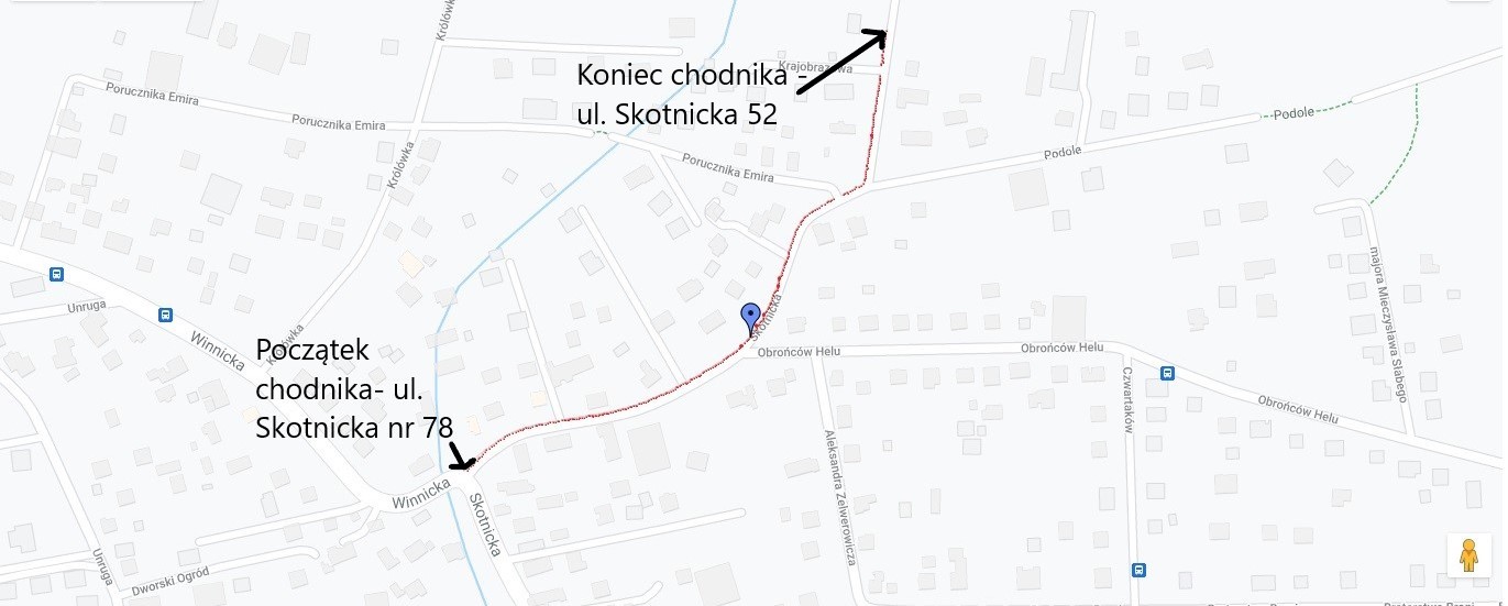 Ulica Skotnicka jest to główna droga w Skotnikach, która prowadzi zarówno do zielonych terenów dla mieszkańców, m.in. Ruczaju oraz Skotnik, jak do szkoły podstawowej dla dzieci, mieszkających w okolicy. Tymczasem ulica Skotnicka na odcinku nr 52-78 nie posiada utwardzonych poboczy, co powoduje, iż poruszanie się mieszkańców wzdłuż tej drogi jest bardzo niebezpieczne, zwłaszcza z uwagi na zwiększony ruch spowodowany powstaniem biurowców przy ulicy Podole oraz otwarciu do nich przejazdu przez ulicę Obrońców Helu i ulicę Skotnicką. Część z mieszkańców rezygnuje z pieszego poruszania się wzdłuż tego odcinka ulicy Skotnickiej, wybierając przemierzenie jej autem, co ma negatywny wpływ na zanieczyszczenie środowiska. Brak utwardzonych poboczy utrudnia również korzystanie z komunikacji miejskiej, gdyż niebezpieczne jest dotarcie do niej.