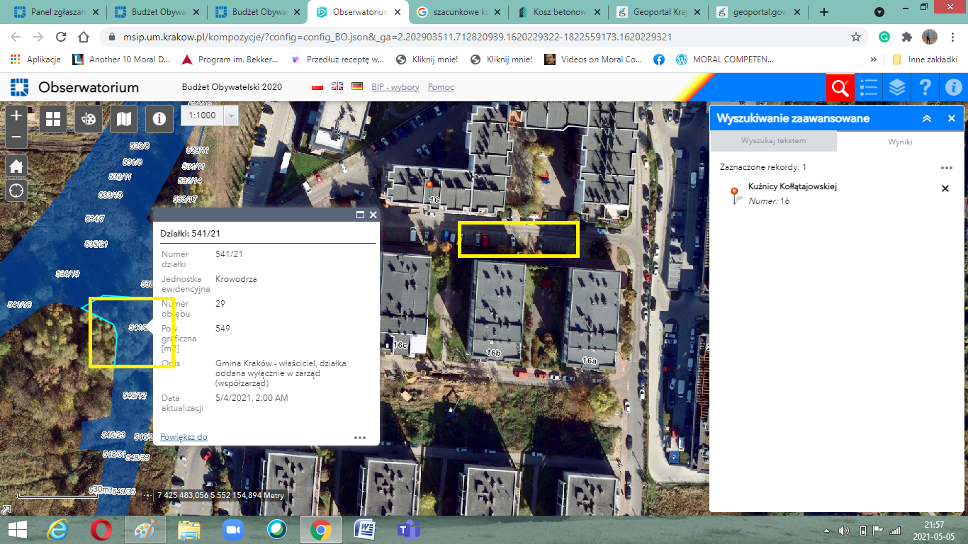 Zadanie miałoby polegać na wydzieleniu na działce o numerze 541/21 16 miejsc parkingowych dla mieszkańców bloku przy ulicy Kuźnicy Kołłątajowskiej 16B i 16A. Szacunkowa wartość projektu miejsc parkingowych z wykonaniem to 400 000 - 640 000 zł (korzystano z dostępnego na stronie BO cennika). Dzięki temu mieszkańcy tej lokalizacji mieliby gdzie parkować, niezależnie od woli dewelopera stawiającego wszędzie inne budynki. Chodzi o zwyczajne miejsca parkingowe, oświetlone jedną latarnią, by w okresie jesienno-zimowym można było czuć się bezpiecznie. Koszt ustawienia jednej latarni ulicznej to około 11 000 - 16 000 zł. Łączna wartość szacunkowa prac: 411 000 - 656 000 zł.