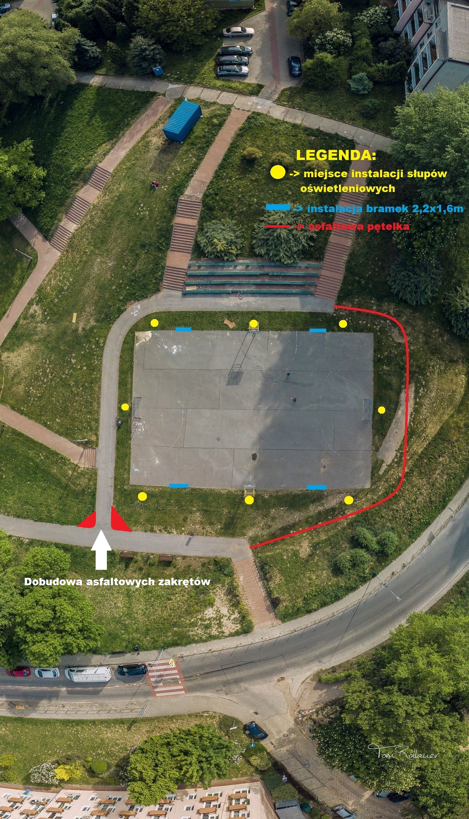 Projekt zakłada instalację oświetlenia oraz umieszczenie czterech małych bramek do piłki nożnej pod koszami do organizacji mini-turniejów dla dzieci na terenie boiska w Parku Zielony Jar.