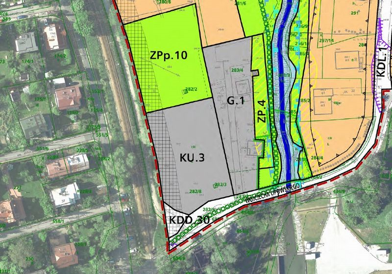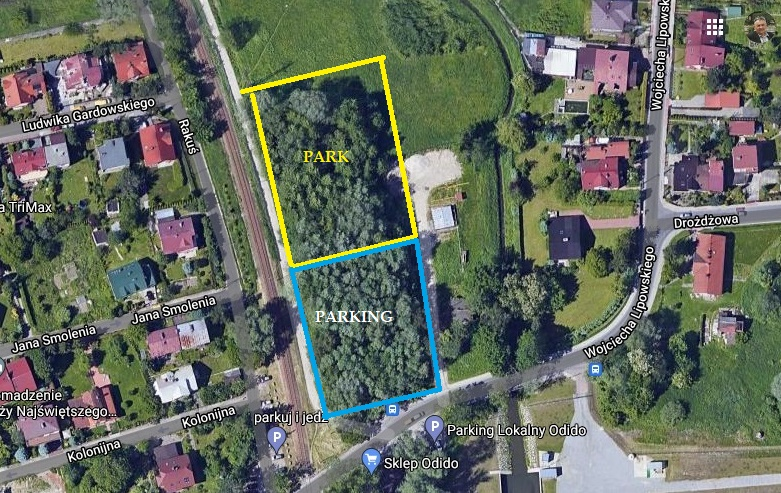 Główna lokalizacja: Lokalizacja: działki ewidencyjne 282/2, 282/8, 282.3 obręb 101. W bliskiej odległości stacji PKP Bieżanów Drożdżownia, przy skrzyżowaniu ulic Ks Łaczka, Lipowskiego, Zamłynie i Rakuś, znajduje się duży teren całkowicie wypełniony samosiejkami ( drzewa, krzewy ). Miejscowy planu zagospodarowania przestrzennego obszaru „Stary Bieżanów” z 2018 roku przyporządkował nieruchomości dwie funkcje:ZPp.10 tj. parki, zieleńce, skwery oraz KU.3 o podstawowym przeznaczeniu pod parking