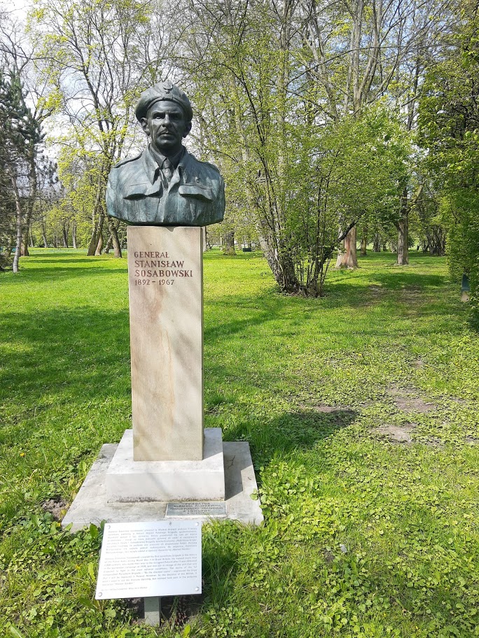 13. gen. Stanisława Sosabowskiego 01-09-2013 - stoi Wzdłuż alei głównej w okolicy kręgu pomnikowego po prawej stronie od wejścia głównego do parku od strony Al. 3 Maja. Brak wyznaczonego miejsca na pomnik w tym miejscu w projekcie z 2006 roku. Pomnik oznaczono dopiero w inwentaryzacji parku ujętej w projekcie z 2018 roku (5 lat po jego postawieniu). Dodatkowo brak jest pozwolenia Miejskiego Konserwatora Zabytków.