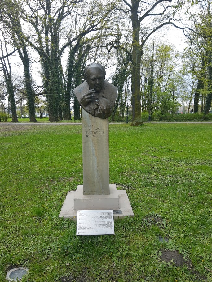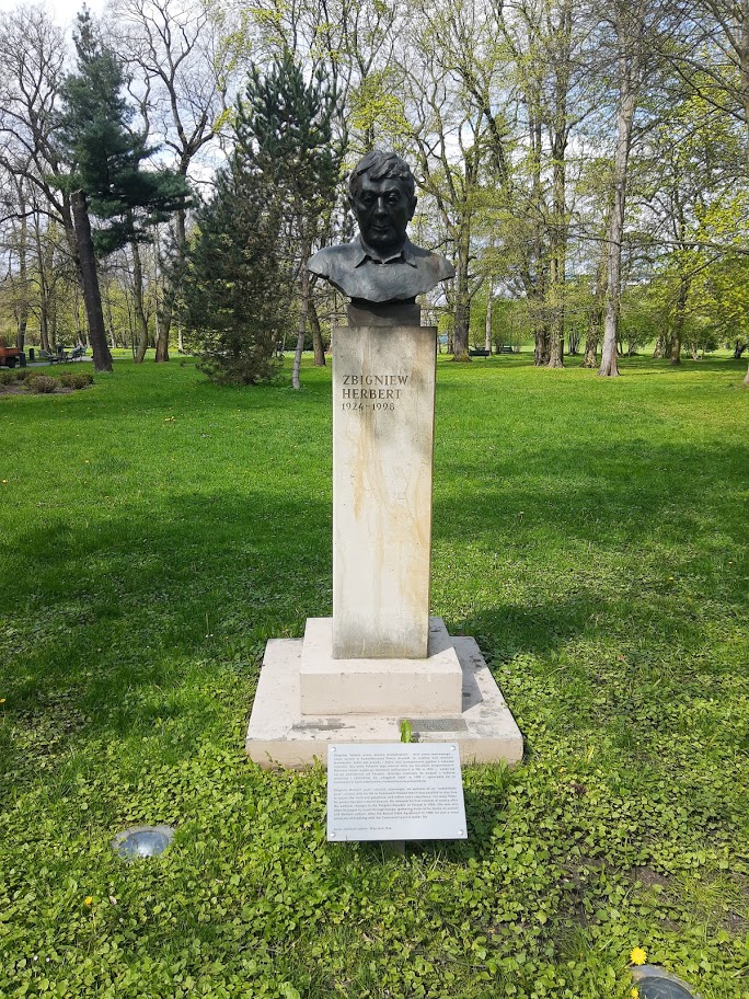 1. Zbigniewa Herberta odsłonięty 29-10-2006 - stoi wzdłuż alei głównej w okolicy kręgu pomnikowego po lewej stronie od wejścia głównego do parku od strony Al. 3 Maja. Brak wyznaczonego miejsca na pomnik w tym miejscu w projekcie z 2006 roku. Pomnik oznaczono dopiero w inwentaryzacji parku ujętej w projekcie z 2018 roku (12 lat po jego postawieniu).