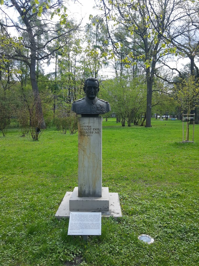 4. gen. Emila Augusta Fieldorfa ''''''''Nila'''''''' odsłonięty 11-11-2007 - stoi wzdłuż alei głównej w okolicy kręgu pomnikowego po prawej stronie od wejścia głównego do parku od strony Al. 3 Maja. Brak wyznaczonego miejsca na pomnik w tym miejscu w projekcie z 2006 roku. Pomnik oznaczono dopiero w inwentaryzacji parku ujętej w projekcie z 2018 roku (11 lat po jego postawieniu).