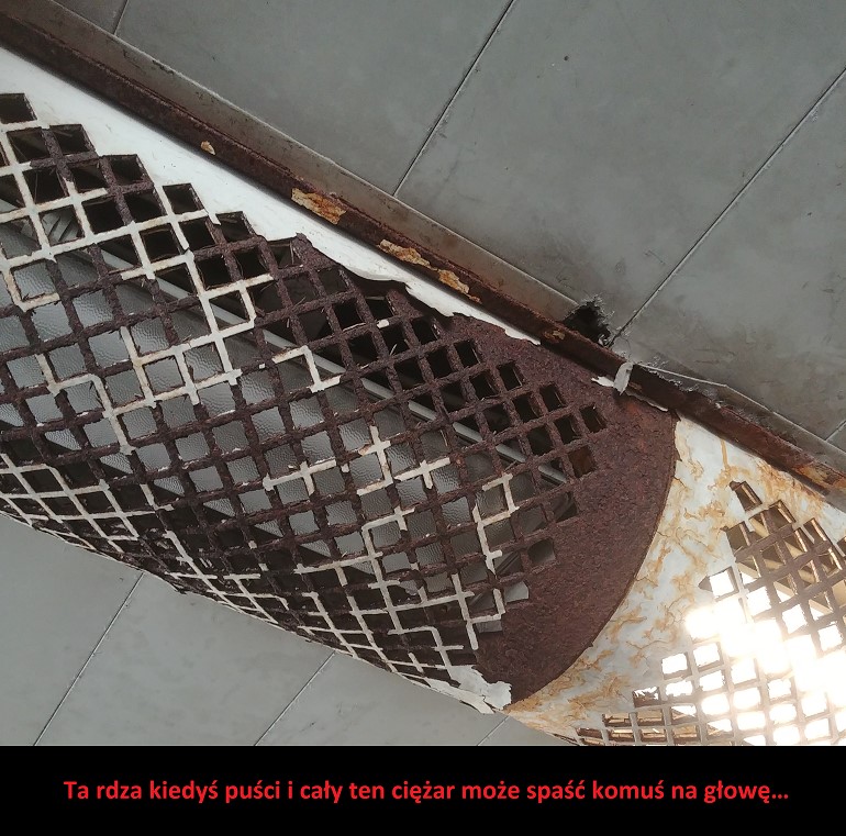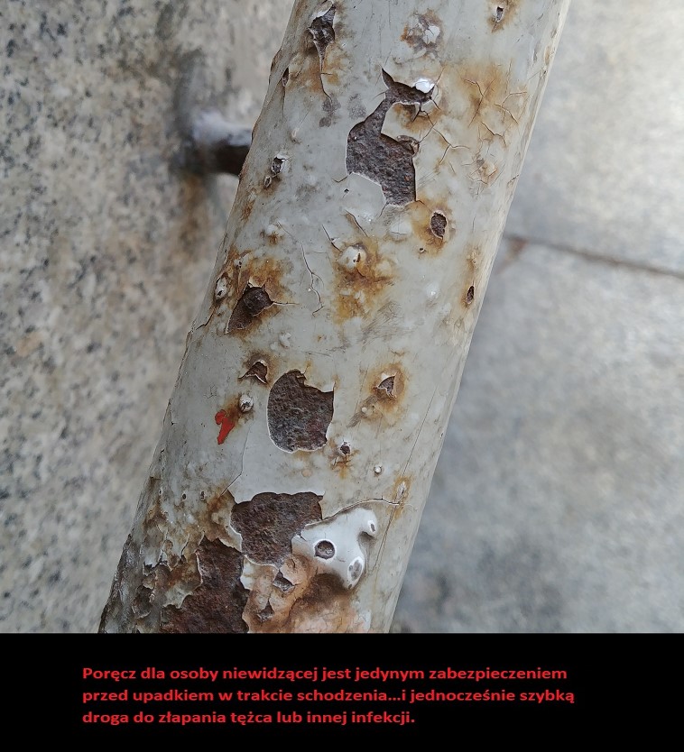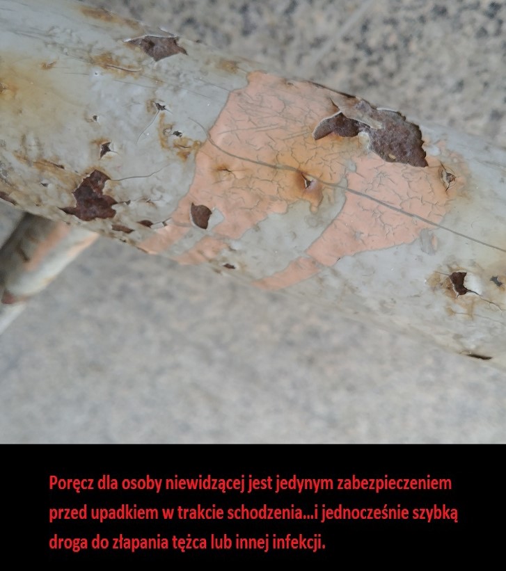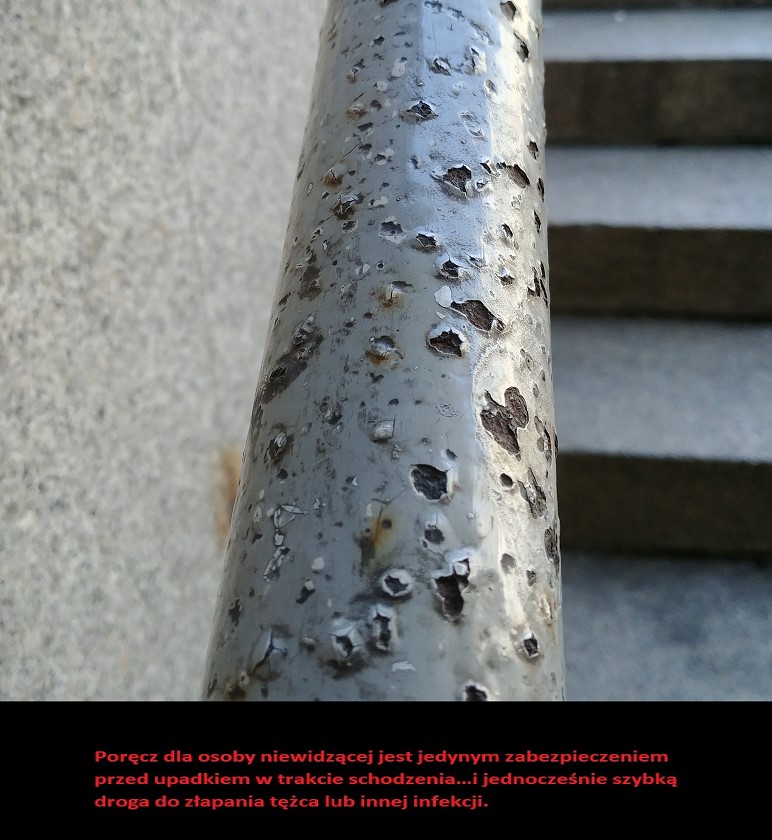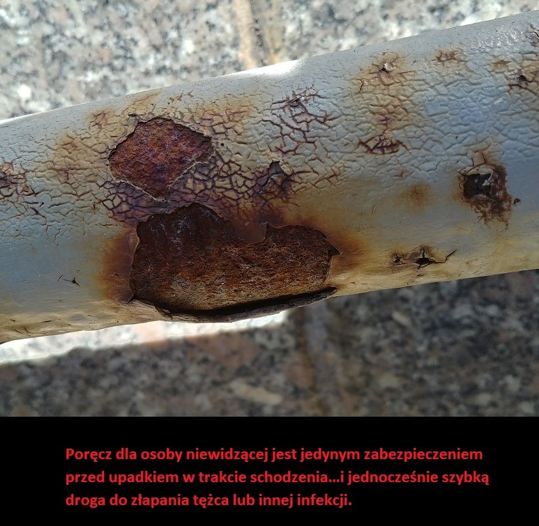 Obecne metalowe poręcze poddawane działaniu czynników atmosferycznych rdzewieją nieustanie. Farba z rdzą zaczyna się odłupywać tworząc zagrodzenie skaleczenia dla osób niewidomych, które musze się chwycić poręczy zwłaszcza w okresie zimowym. Te odłamki farby i rdzy są zagrożeniem tężca i innych infekcji, dlatego należy stosować kompozytowa/plastikową powłokę na poręczy tak by zawsze była bezpieczna do chwycenia. Zadaszenie ponad schodami dodatkowo sprawi, że będzie ona sucha.