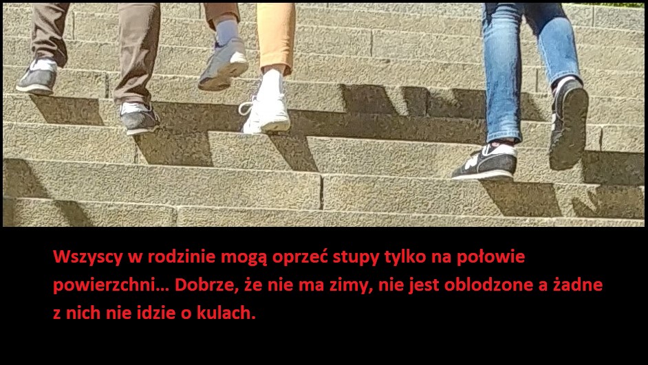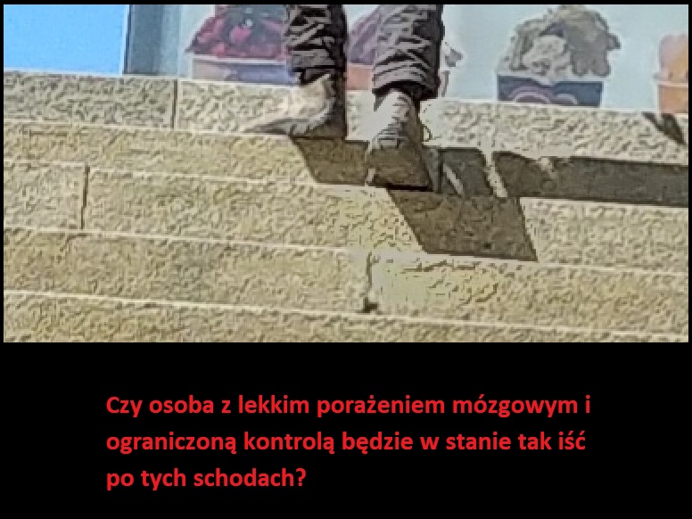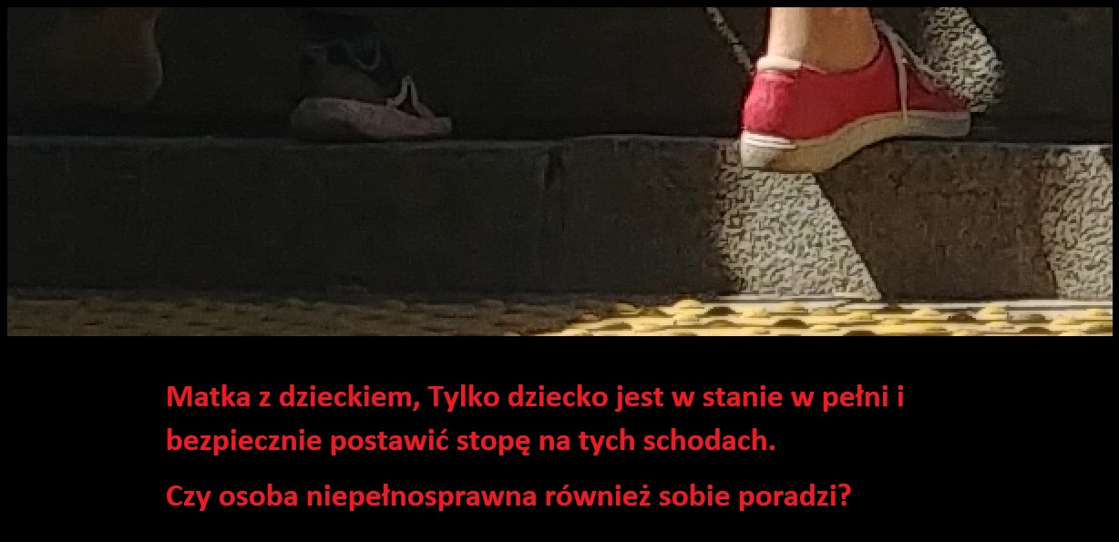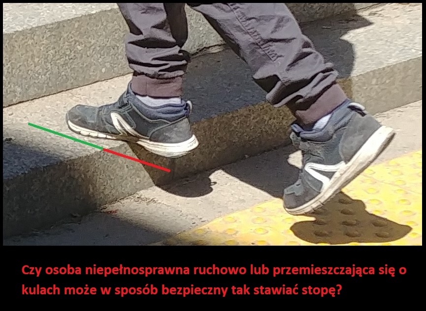 Schody w obecnym stanie posiadają absolutnie minimalna długość, co sprawia ze stopa/but osoby wchodzącej jest średnio w połowie zawieszona. Większość osób w taki sposób właśnie przemieszcza się po tych schodach, co w przypadku oblodzenia dodatkowo zwiesza ryzyko upadku i złamania kończyny lub nadwyrężenia stawu. Dla osób niepełnosprawnych są one za krótkie. Zwłaszcza dla osób przemieszczających się o kulach, których stopy dość często są w pewnym stopniu bezwładne lub poziom kontroli jest ograniczony. Jest to niezwykle przykry widok, gdy osoba niepełnosprawna zmuszona by użyć tego przejścia musi wkładać więcej wysiłku w ułożenie stopy i piety na tych schodach niż w samo chodzenie o kulach.