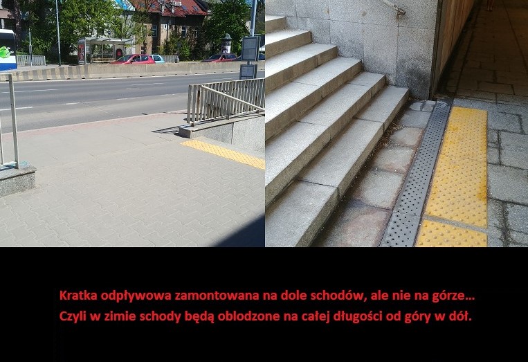 Zapewnia sprawny odpływ topniejącej wody tak by nie tworzył się lód na schodach i ślizgawice, na których ludzie wywracają się zwłaszcza na zakręcie pod łącznikiem drogowym.