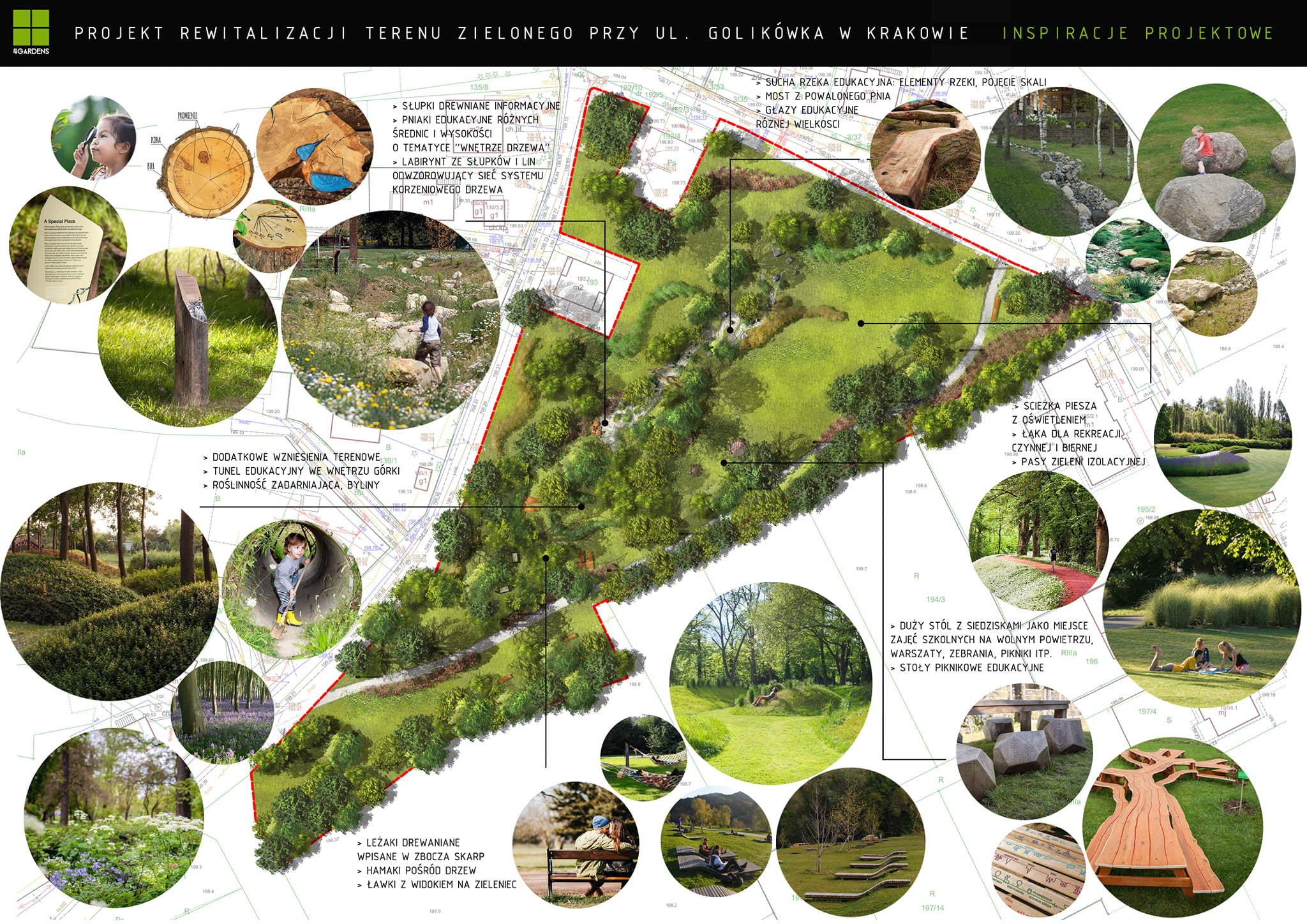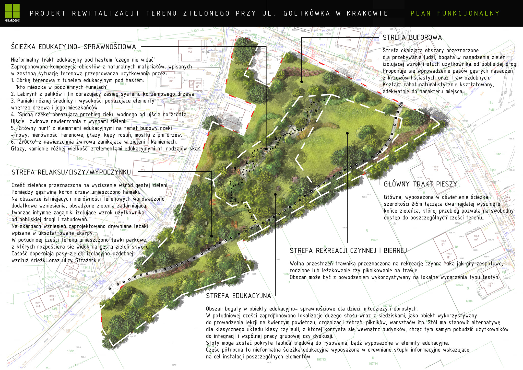 Całość podzielono na strefy funkcjonalne płynnie ze sobą połączone poprzez zieleń oraz trakt