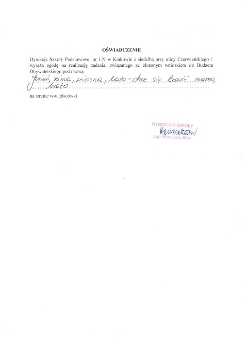 Zadanie polega na rozbudowie istniejącego placu zabaw przy Szkole Podstawowej nr 119 w Krakowie, na Azorach o nowe urządzenia, takie jak: zjeżdżalnia na linie, dwóch huśtawek typu „bocianie gniazdo” oraz aktywizującego dzieci, wielofunkcyjnego zestawu kreatywnego do zabaw (m.in. zabawa w kółko i krzyżyk, tor między linami, mini ścianka wspinaczkowa). Jego celem jest podniesienie atrakcyjności jedynego placu zabaw zlokalizowanego na osiedlu obejmującym rejon szkoły, przedszkola i żłobki. Zastosowane w urządzeniach rozwiązania pozwalają na wszechstronny rozwój dziecka. Dzieci bawiąc się, jednocześnie ćwiczą swoje ciała i umysły.Cele projektu Istniejący plac zabaw służy dzieciom uczęszczającym do szkoły w godzinach jej pracy, ale także jest miejscem chętnie odwiedzanym przez rodziny z dziećmi poza godzinami pracy obiektu, w tym w weekendy. Korzystają z niego dzieci z terenu całej dzielnicy i nie tylko.Realizacja zadania poprawi znacznie jakość przestrzeni publicznej tej części miasta. Aby urządzenia zostały zamontowane zgodnie z normami i spełniły wszelkie wymogi bezpieczeństwa niezbędnym jest przeprowadzenie także wymiany chodnika w obrębie placu zabaw; który to w chwili obecnej stwarza niebezpieczeństwo dla bawiących się tam dzieci.