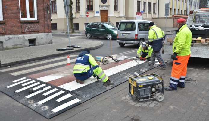 Montaż trzech bezpiecznych wyniesień jezdni z przejściami dla pieszych na Zabłociu w obszarze strefy ograniczenia ruchu do 30 km/h.