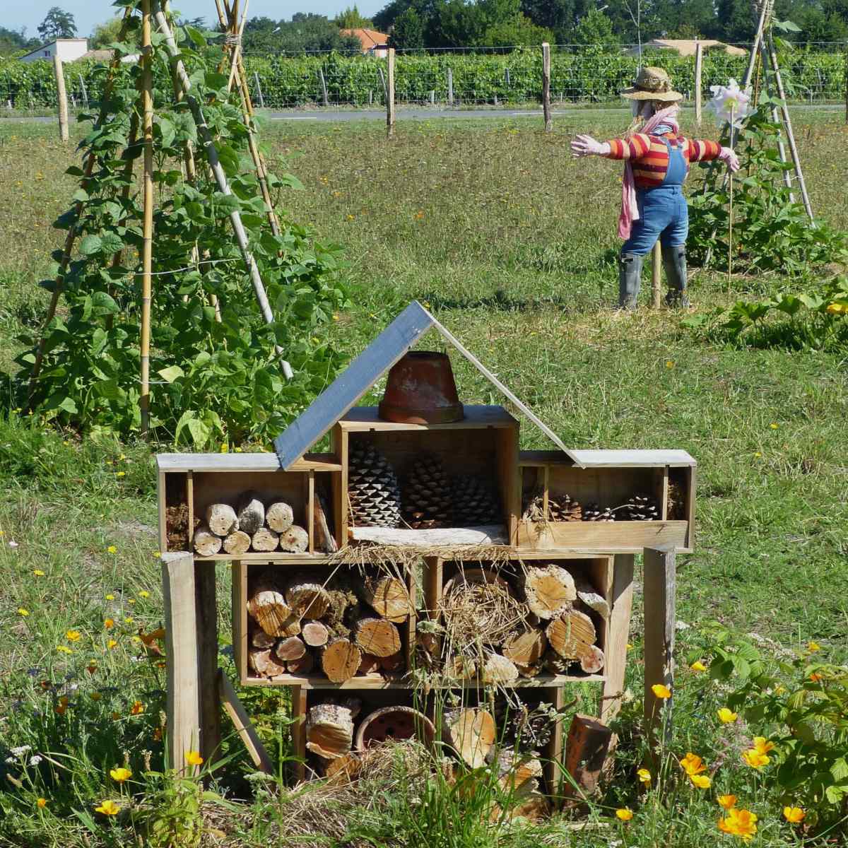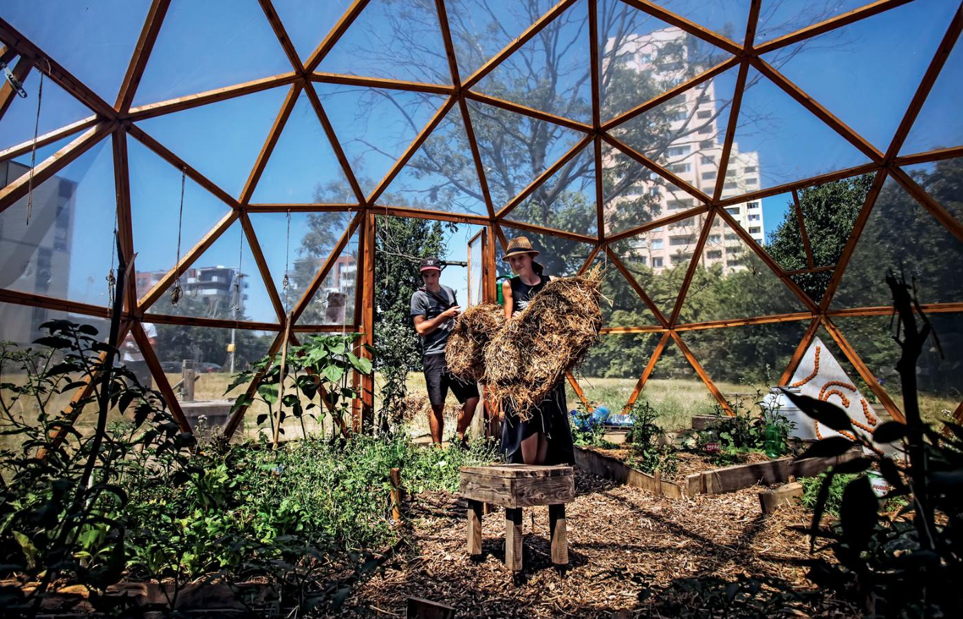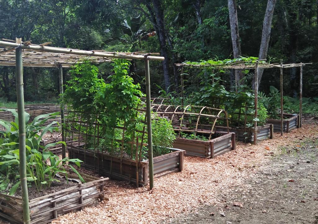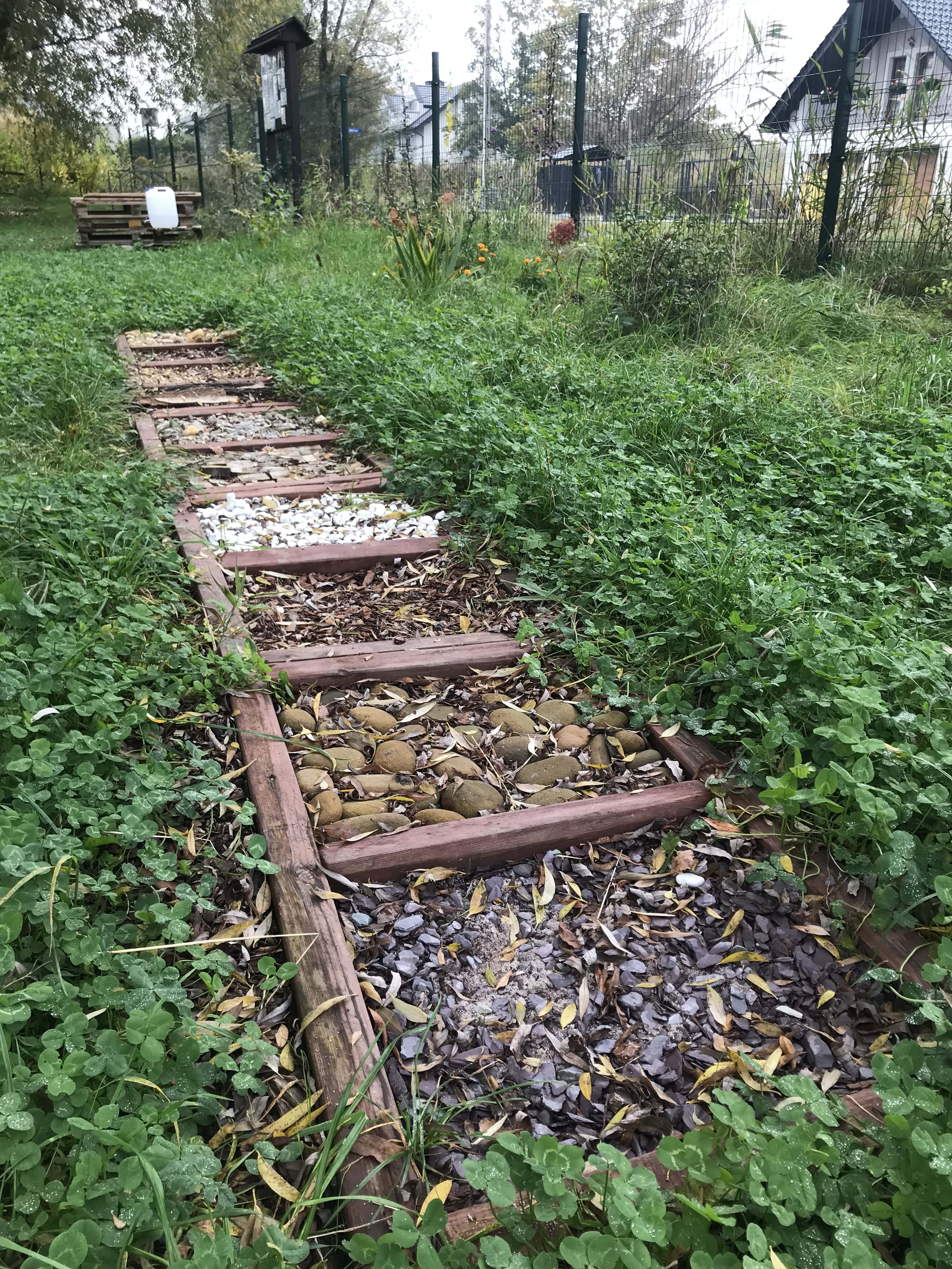 ● strefa użytkowa (podniesione grządki wykonane w duchu ogrodnictwa permakulturowego z warzywami, ziołami i owocami)