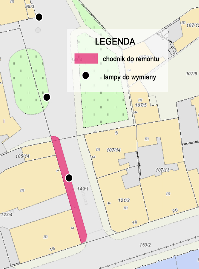 - remont chodnika na ulicy Bartosza z materiałów nawiązujących do sąsiednich nowo-wyremontowanych ulic (płytka bezfazowa). Ostateczny rodzaj nawierzchni uzależniony jest od opinii konserwatorskiej.