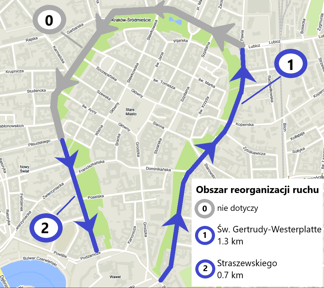 Projekt zakłada zmiany w ruchu na ulicach Św. Gertrudy, Westerplatte oraz Straszewskiego (zaznaczone kolorem fioletowym na poniższej mapce).