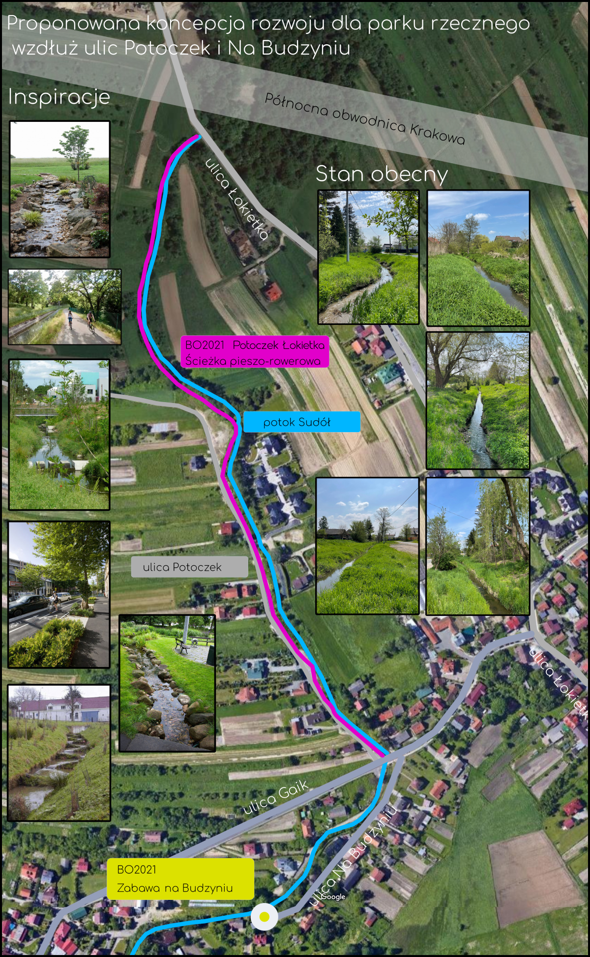 O ile część biegnąca przez łąki powinna pozostać w możliwie nienaruszonym stanie, to południowa połowa trasy wzdłuż ul. Potoczek, wijąca się między domkami jednorodzinnymi, docelowo (np. w przyszłych edycjach BO) mogłaby zostać wzbogacona o nasadzenia, elementy infrastruktury (np. ciekawe mostki nad Sudołem) i małą architekturę (ławki, kosze, hamaki). Wszak wyregulowany potok Sudół zatracił już swój dziki charakter wzdłuż ul. Potoczek i ul. Na Budzyniu. W przyszłości uporządkowanie zieleni, zaprojektowanie nowych nasadzeń i wyhamowanie potoku zwiększyłoby miejscowo retencję i nadałoby tej okolicy cechy parku kieszonkowego na skraju półdzikiego Parku Rzecznego Tonie.