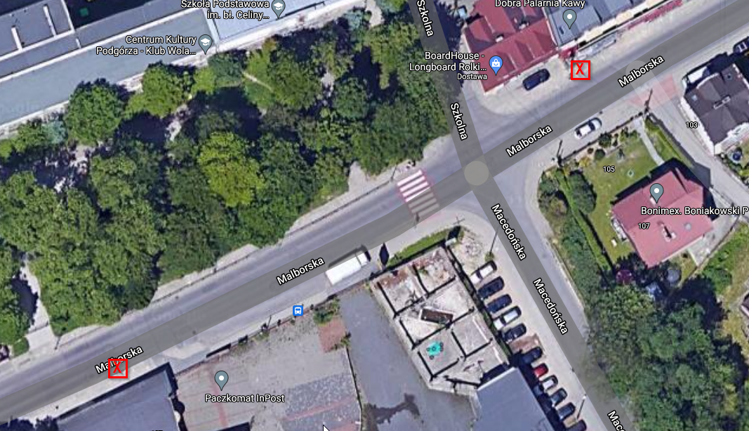 Główna lokalizacja: Ulica Malborska w obu kierunkach przed skrzyżowaniem z ulicami Szkolną i Macedońską