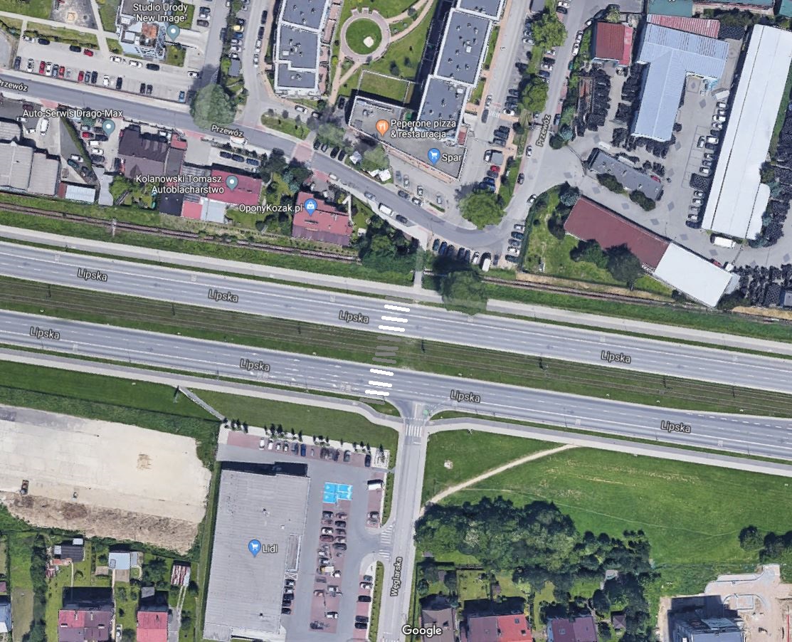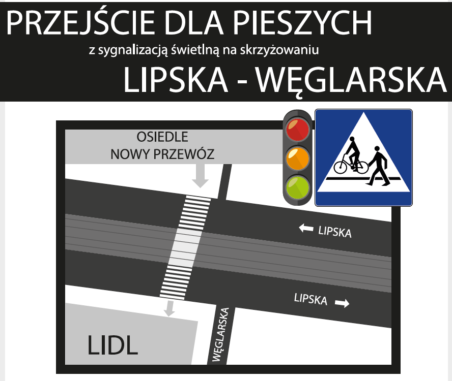 Zadanie polega na przywróceniu istniejącego przejścia dla pieszych z sygnalizacją (z przejazdem dla rowerów) przez ul Lipską na wysokości skrzyżowania z ul Węglarską.