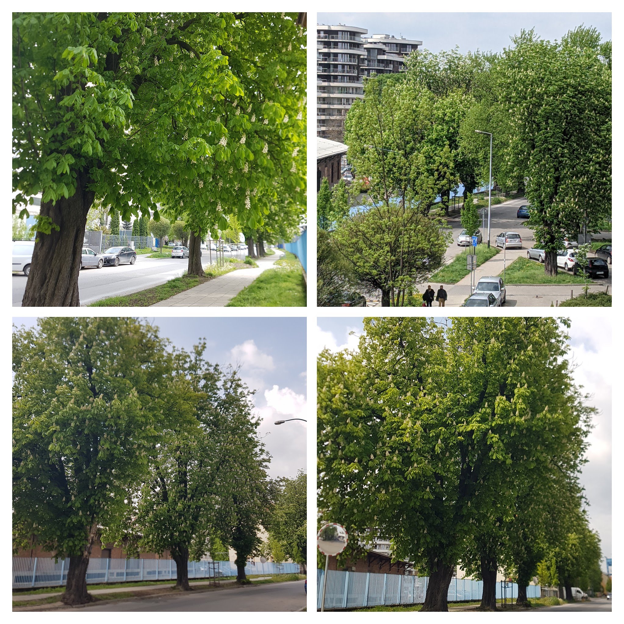 Aktualnie zieleń na tym terenie jest bardzo ograniczona i słabej jakości. Niewątpliwym atutem zieleni na tym terenie są kasztanowce rosnące przy Cystersów (widoczne na zdjęciach poniżej), które znacząco wyróżniają się z otoczenia, a dzięki nim ulica nabiera charakteru kasztanowej alei. Stąd pomysł, by podtrzymać ten charakter poprzez nasadzenia nowych, dużych drzew kasztanowców wzdłuż Cystersów i Fabrycznej, na całej długości ulicy pomiędzy Mogilską a Aleją Pokoju.