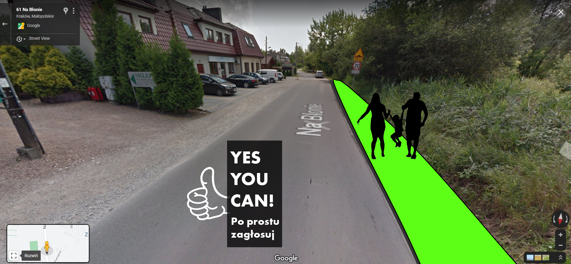 Budowa ścieżki dla pieszych oddzielonej od jezdni pasem zieleni po zachodniej stronie ul. Na Błonie (w rejonie boiska KS Bronowianka). Utworzenie pieszego połączenia Bronowic i Woli Justowskiej, umożliwienie bezpiecznego dojścia pieszo do terenów sportowych przy ul. Na Błonie.