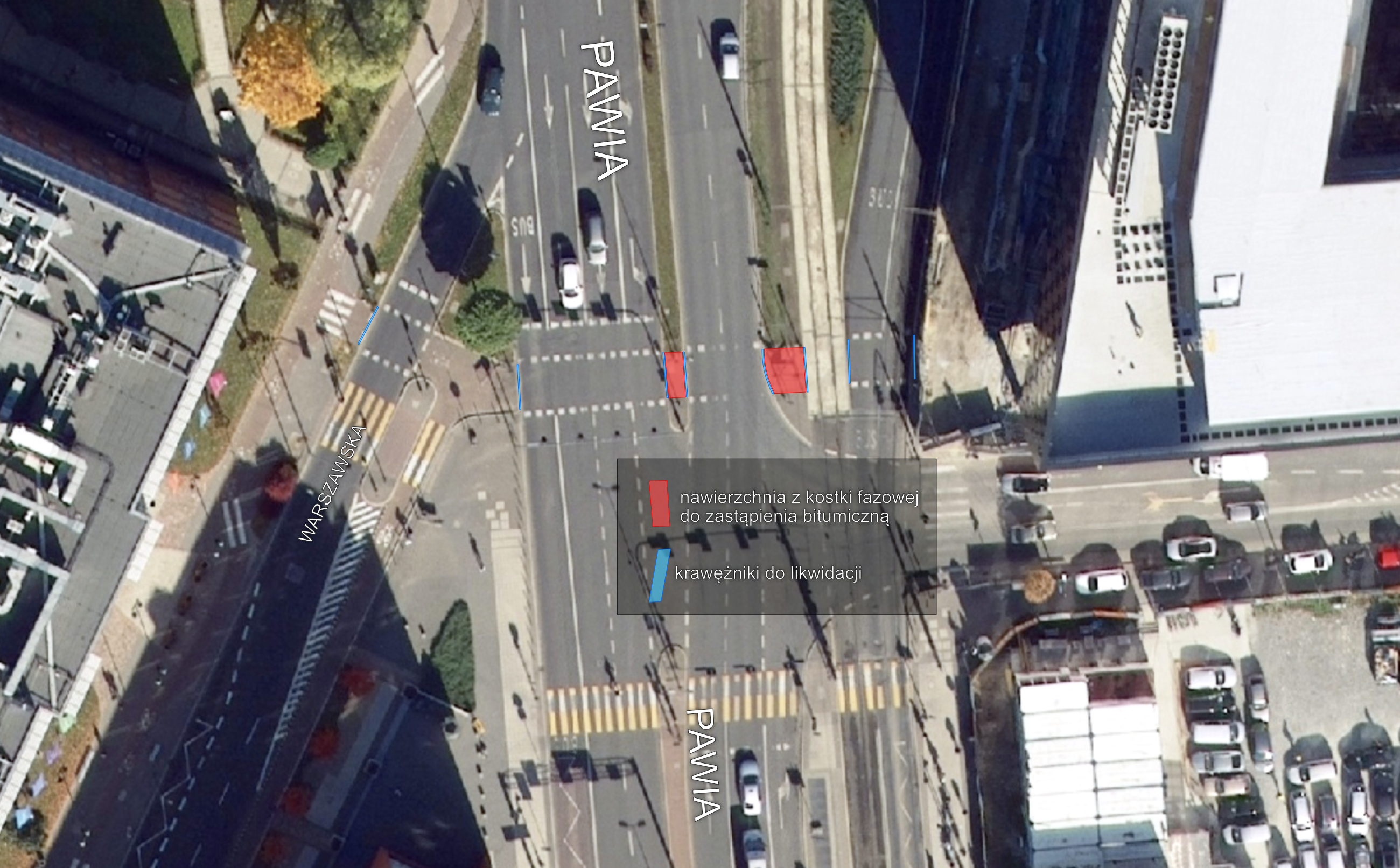Główna lokalizacja: Przejazd rowerowy przez ulicę Pawią i Warszawską na wysokości skrzyżowanie Pawiej z Warszawską.