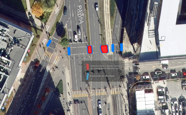 Obecnie przejazd rowerowy przez ulicę Pawią na wysokości ulicy Warszawskiej jest wyjątkowo niewygodny i nieprzyjemny dla rowerzystów i rowerzystek ze względu na osiem wysokich na kilka centymetrów krawężników poprzecznych, czterech rowków szyn, a także kilkukrotną zmianę nawierzchni (na kostkę fazową!). Realizacja tego zadania w Budżecie Obywatelskim pozwoli na zwiększenie dostępności infrastruktury rowerowej dla osób, które są mniej doświadczone w jeżdżeniu rowerem po mieście. Pozwoli również na znaczną i niepomijalną poprawę komfortu wszystkich rowerzystów i rowerzystek. Poprawa oznakowania zwiększy również poziom bezpieczeństwa wszystkich uczestników ruchu.
