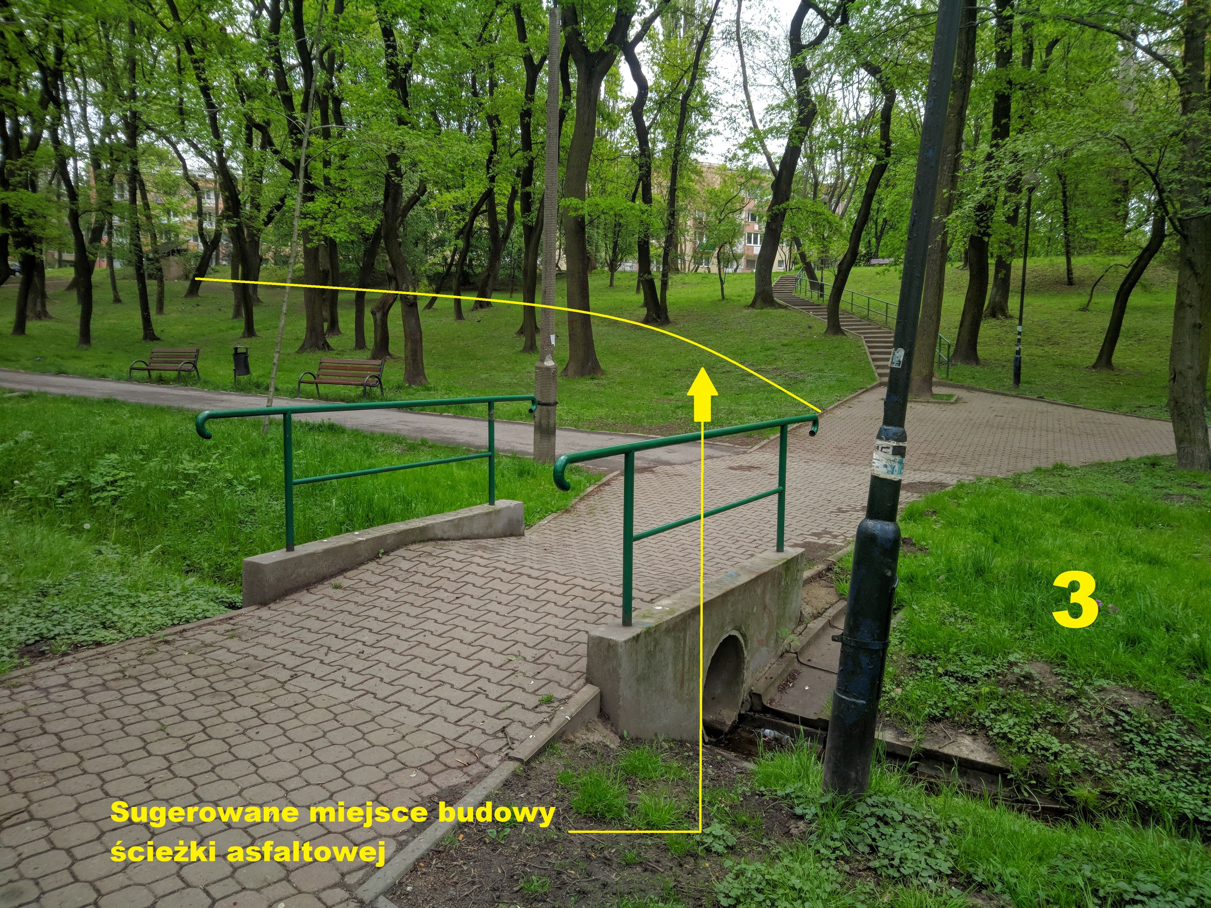 Utwardzenie brakujących odcinków i remont zniszczonej drogi dojazdowej do śmietników bloków os. Na Wzgórzach nr 7/8/9/10 i połączenie jej z kładką nad strumykiem w parku Zielony Jar.