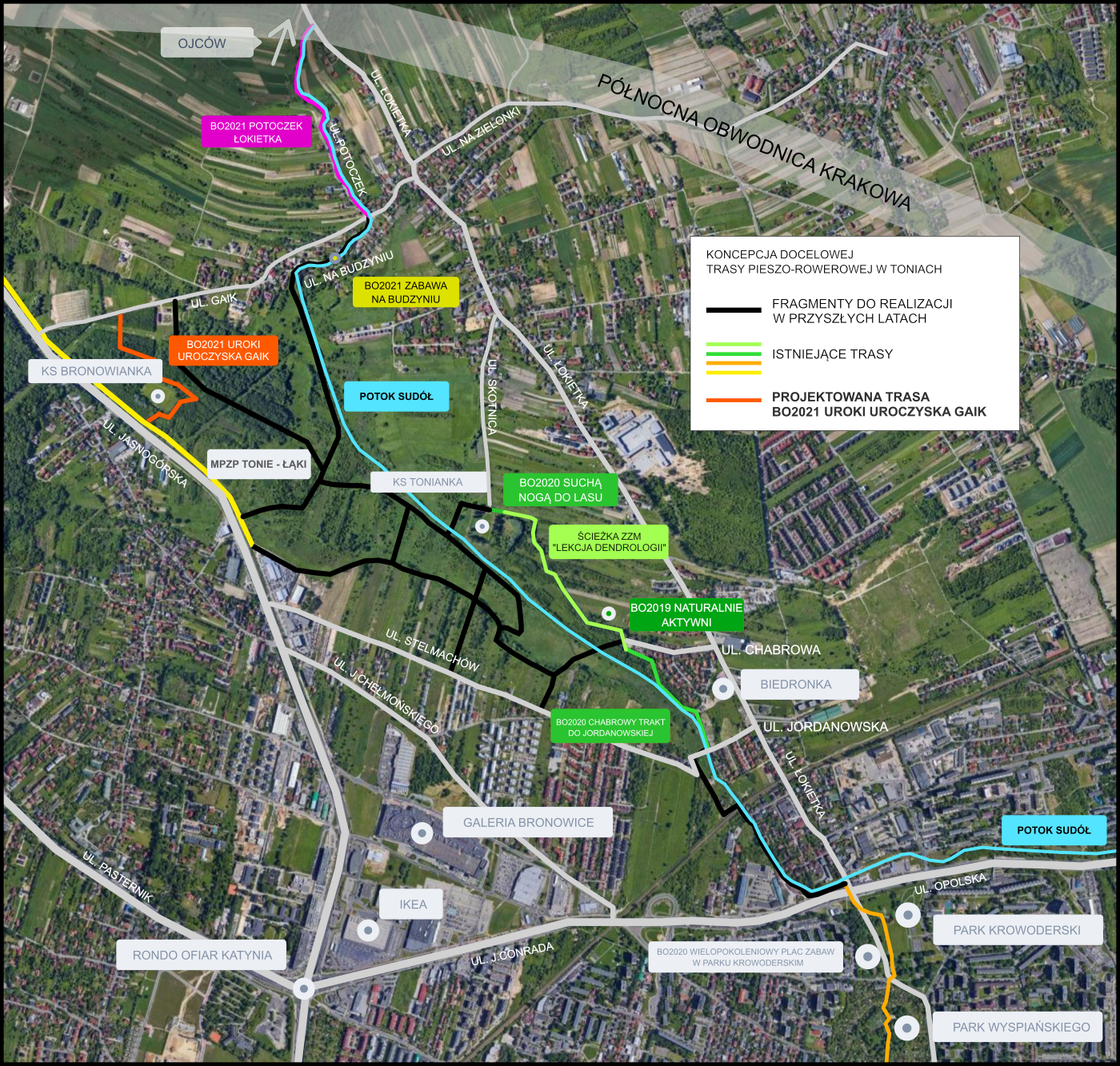 Przez ostatnie dwie edycje BO udało nam się wspólnie “wywalczyć” skwer rekreacyjny i przedłużenie ścieżki edukacyjnej ZZM - wszystko na skraju południowego lasu w Toniach. Dalsze rozwijanie ścieżek w lesie chwilowo wstrzymujemy na prośbę leśników; w łąki bezpośrednio przy nim leżące też nie możemy ingerować, bo choć obowiązujący tam MPZP “Tonie - Łąki” przewiduje docelowo trasy spacerowo-rowerowe, to obecnie tereny te należą do prywatnych właścicieli. Jednak dzięki BO możemy stworzyć kolejny fragment trasy na terenach miejskich…