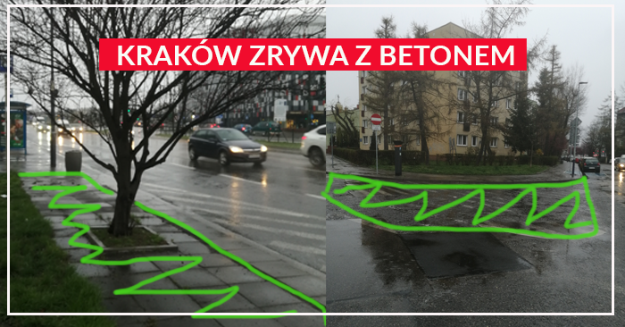 Czas betonu się skończył w Krakowie. Mieszkańcy chcą zieleni, drzew. Niech Kraków, przykładem innych stolic europejskich, rozbetonuje chodniki i ulice. Miasto powinno się adaptować do zmian klimatu, bo za 10 lat będzie w naszym mieście piekło - dosłownie - temperatury latem w miejscach bez drzew, zieleni, dochodzić będą do 50-60 stopni. Każdy skrawek zieleni jest bardzo ważny. Twórzmy trawniki, sadźmy drzewa, krzewy, a nie budujmy nowych parkingów. Pamiętajmy, że tereny zielone pomagają absorbować wodę podczas deszczy.