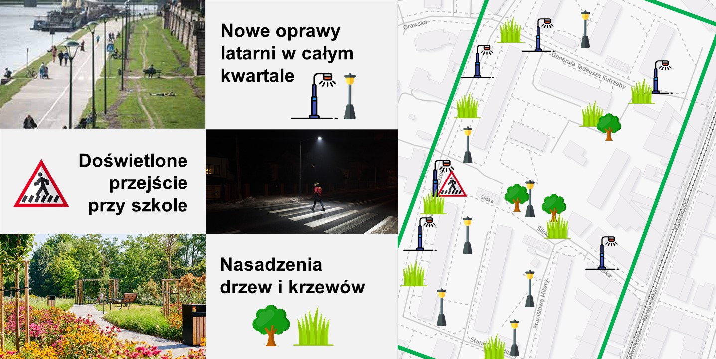 Projekt zakłada powstanie zielonej i bezpiecznej przestrzeni dla mieszkańców Starego Podgórza: 1. nowe latarnie, 2. nasadzenia drzew,krzewów i traw 3. doświetlenie przejścia przy Szkole Podstawowej nr 26