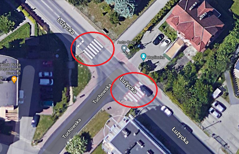Dodatkowe lokalizacje: Dwa przejścia dla pieszych ulokowane na ul. Łużyckiej po dwóch stronach podporządkowanej ul. Tuchowskiej.