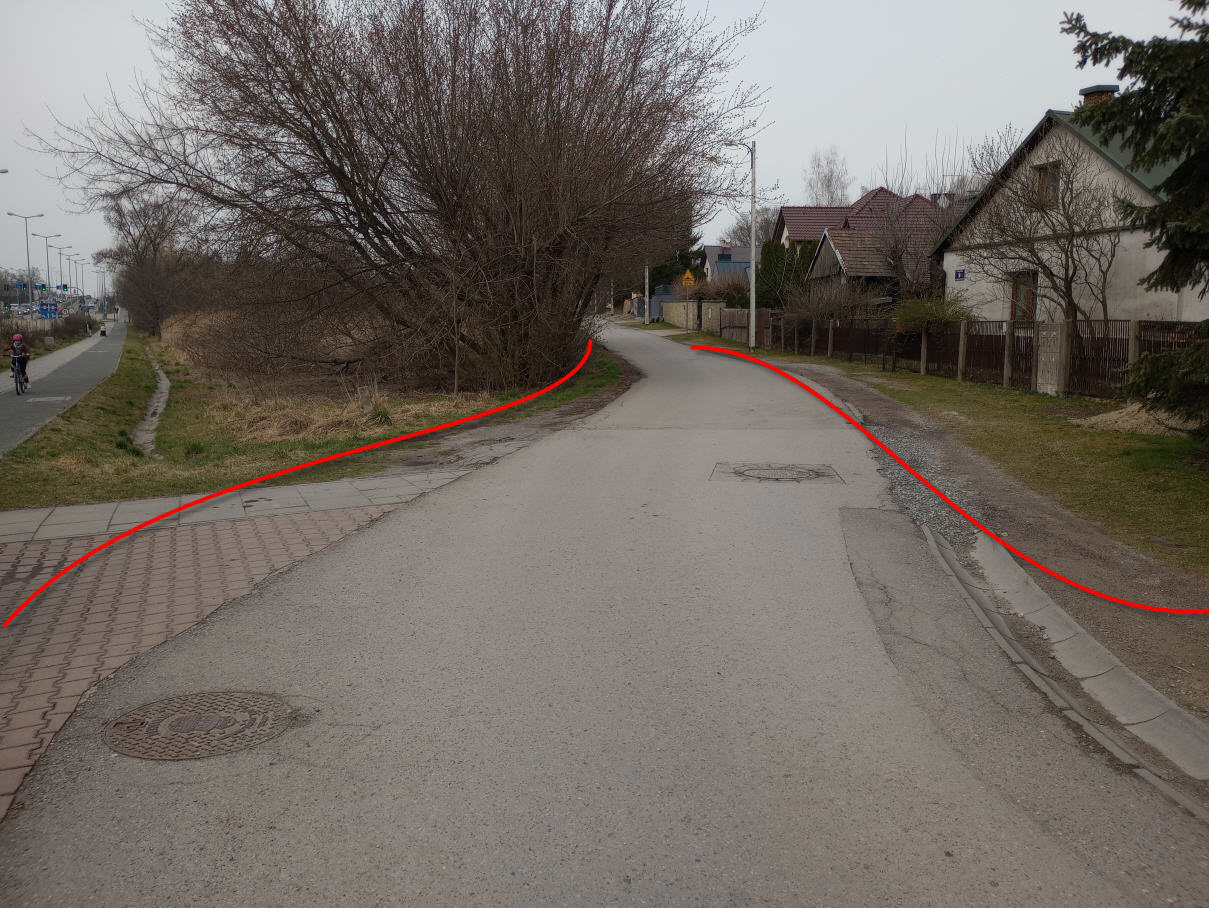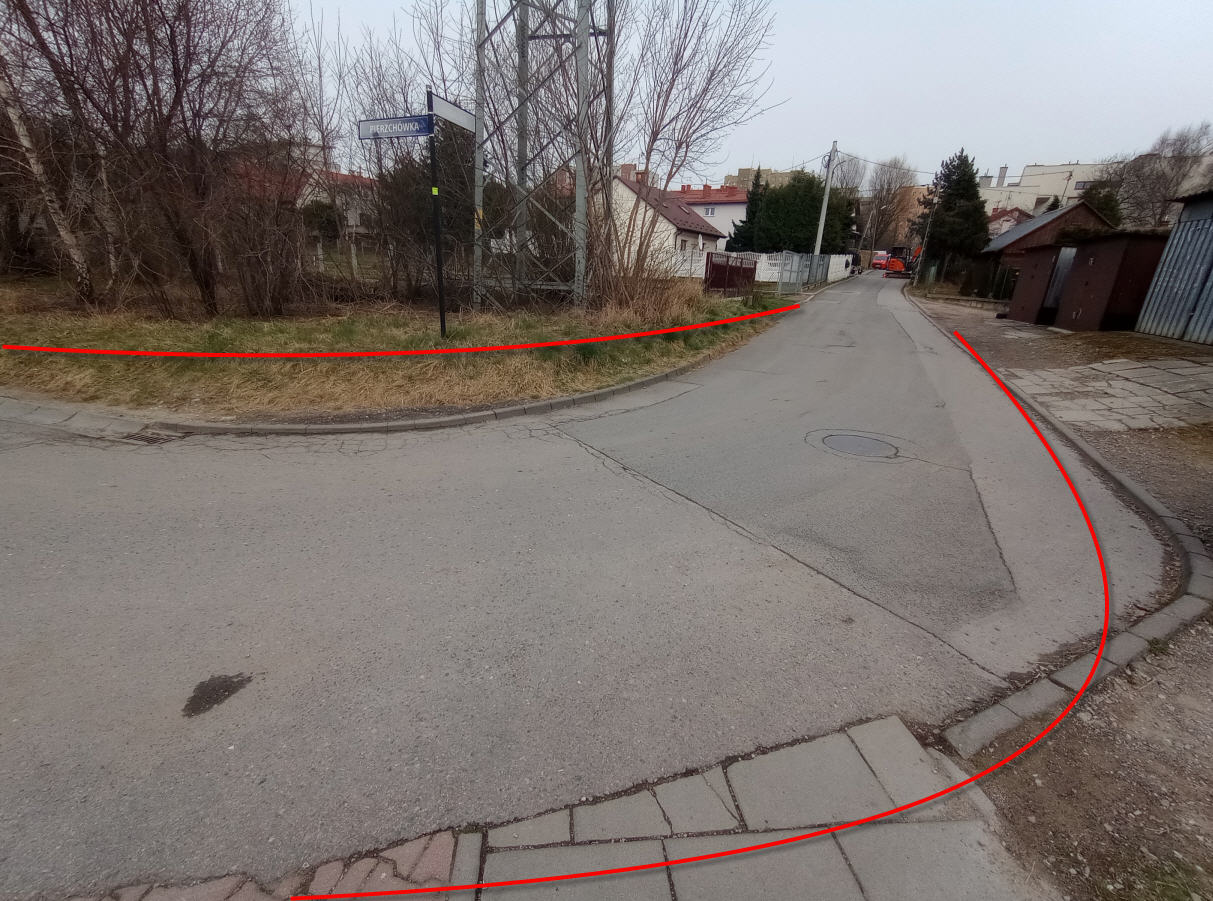Dodatkowo (obowiązkowo) w zakres projektu wchodzi wyrównanie terenu działki 231/2 do poziomu ulicy oraz zastąpienie obecnej roślinności niskiej i średniej taką, która uniemożliwi zarastanie tego terenu wysoką trawą i krzakami, co ma obecnie miejsce, a przy rzadkim koszeniu traw w Krakowie znacząco utrudnia ruch pojazdów poprzez ograniczanie widoczności przed i w zakręcie. Chętnie zachowamy część tej działki, która pozostanie poza zakresem nowego przebiegu drogi jako teren zielony, ale tak by nie ograniczał widoczności kierowcom i pieszym. W ostateczności dopuszczamy inny rodzaj nawierzchni przy samej jezdni.