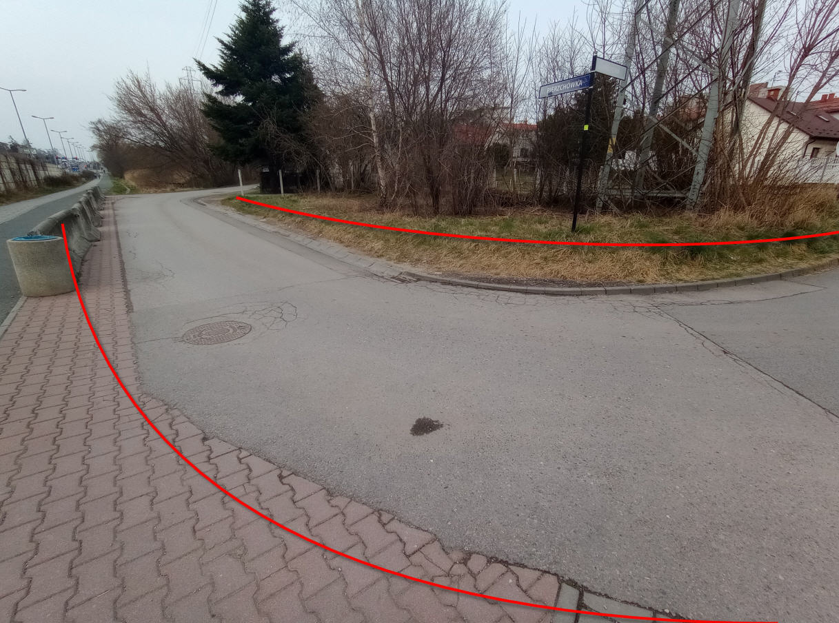 Przebudowa zakrętu drogi osiedlowej poprzez zmianę jego przebiegu oraz poszerzenie łuku drogi, przesunięcie ścieżki rowerowej i chodnika oraz zmiana zagospodarowania działki na wewnętrznej zakrętu w celu poprawy widoczności.
