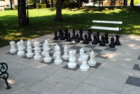 2. Wokół planszy znajdziemy 3 kamienne stoliki z krzesłami i namalowaną standardową planszą do gry w szachy. Na jednym z tych stolików znajdziemy zmodyfikowaną wersję dla 3 osób (jak w “Ojcu Mateuszu”).