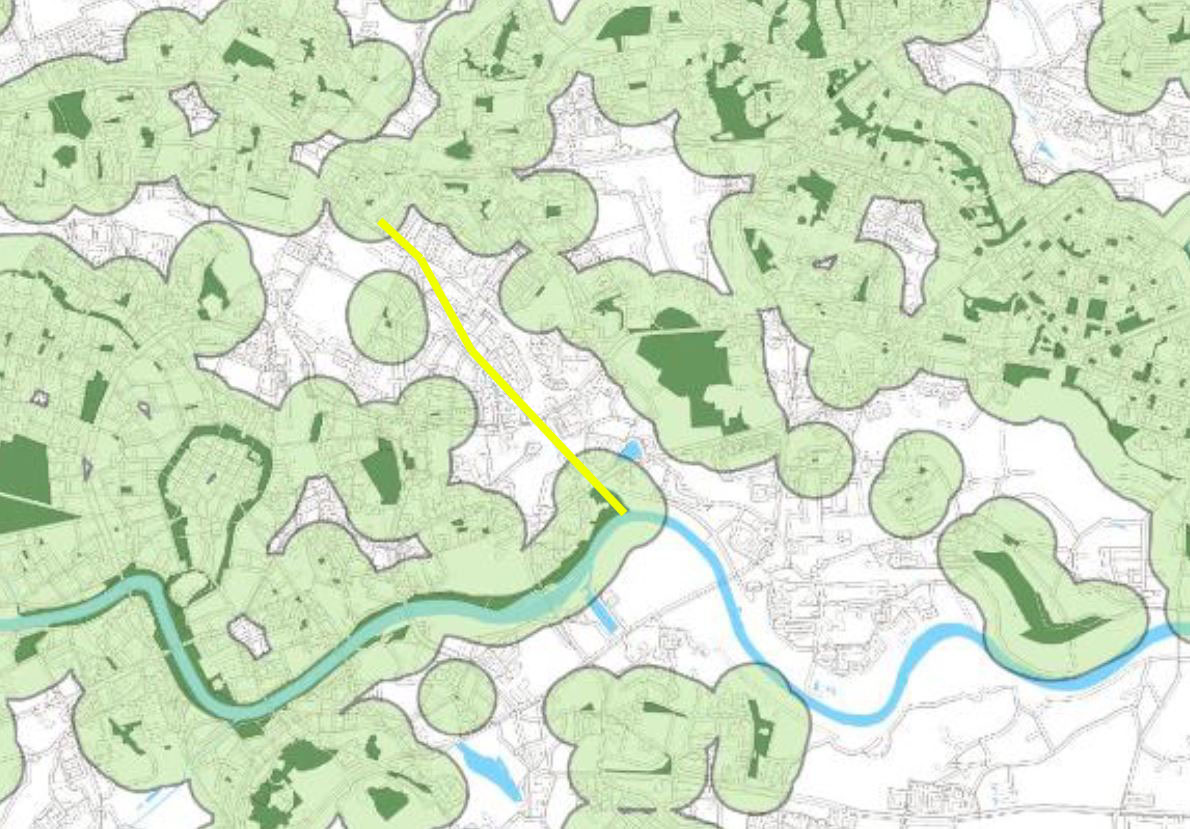 W analizie przedstawiającej 300 metrową odległość dotarcia mieszkańców do terenu zielonego obszar rzeki Białuchy stanowi pustą przestrzeń, na której wielu mieszkańców oczekuje powstania parku linearnego z możliwością dotarcia do rzeki Wisły.
