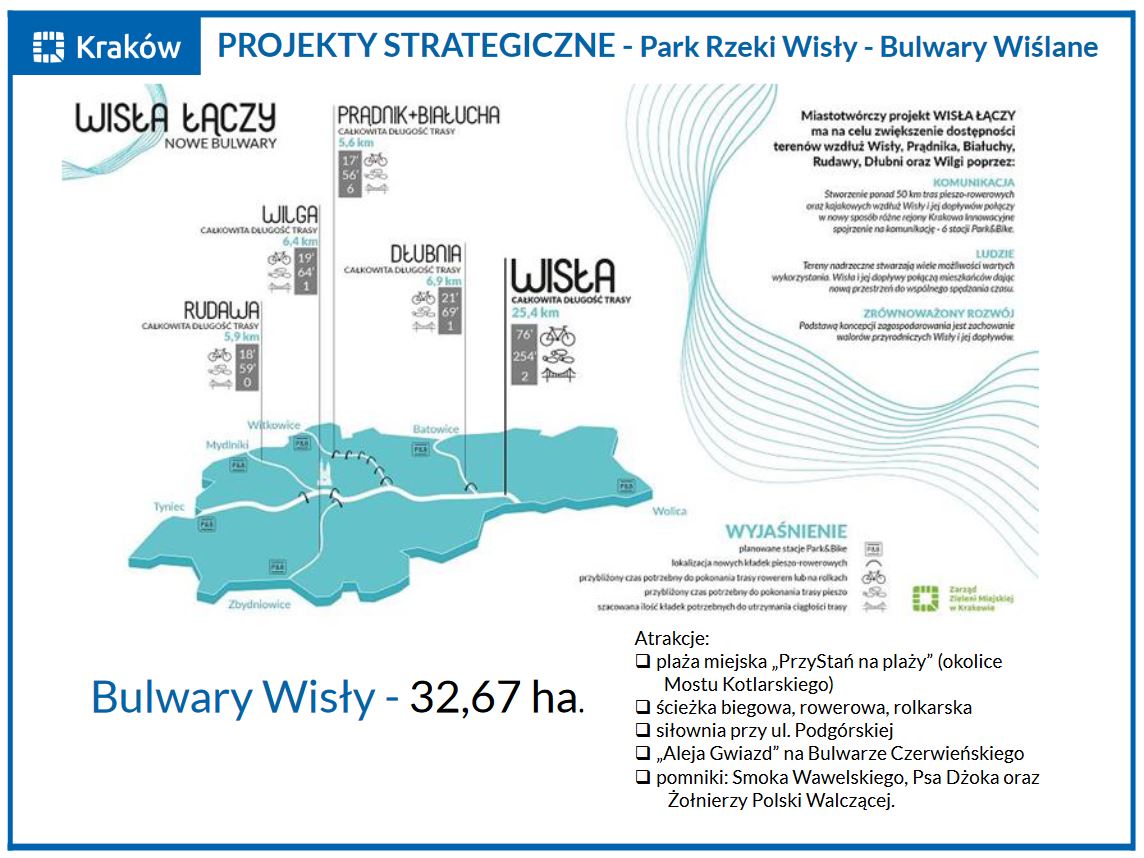 Projekt przewiduje utworzenie parku linearnego wzdłuż rzeki Białuchy (Prądnik) w miejscu - trójstyku granic pomiędzy Dzielnicami I,II i III. Umożliwi to w przyszłości przedostanie się mieszkańcom sąsiadujących dzielnic do rzeki Wisły.
