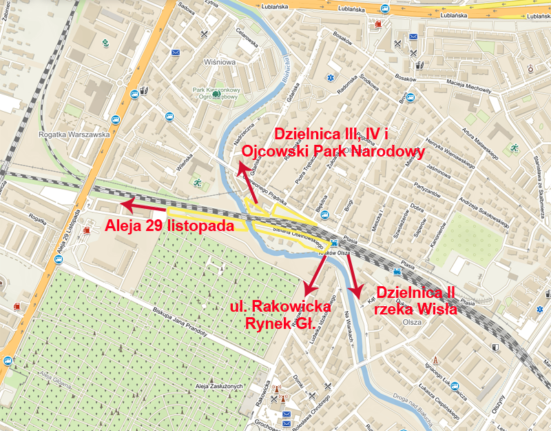 Na północ istnieje możliwość dojścia do ul. Lublańskiej i Dzielnicy IV, a potem, w sposób niemal pozbawiony przeszkód tranzytowych aż do Ojcowskiego Parku Narodowego, na wschód do rzeki Wisły, na południe do centrum miasta ul. Rakowicką) oraz na zachód - połączenie z okolicą Dworca Towarowego i ważnymi węzłami komunikacyjnymi oraz al. 29. listopada.