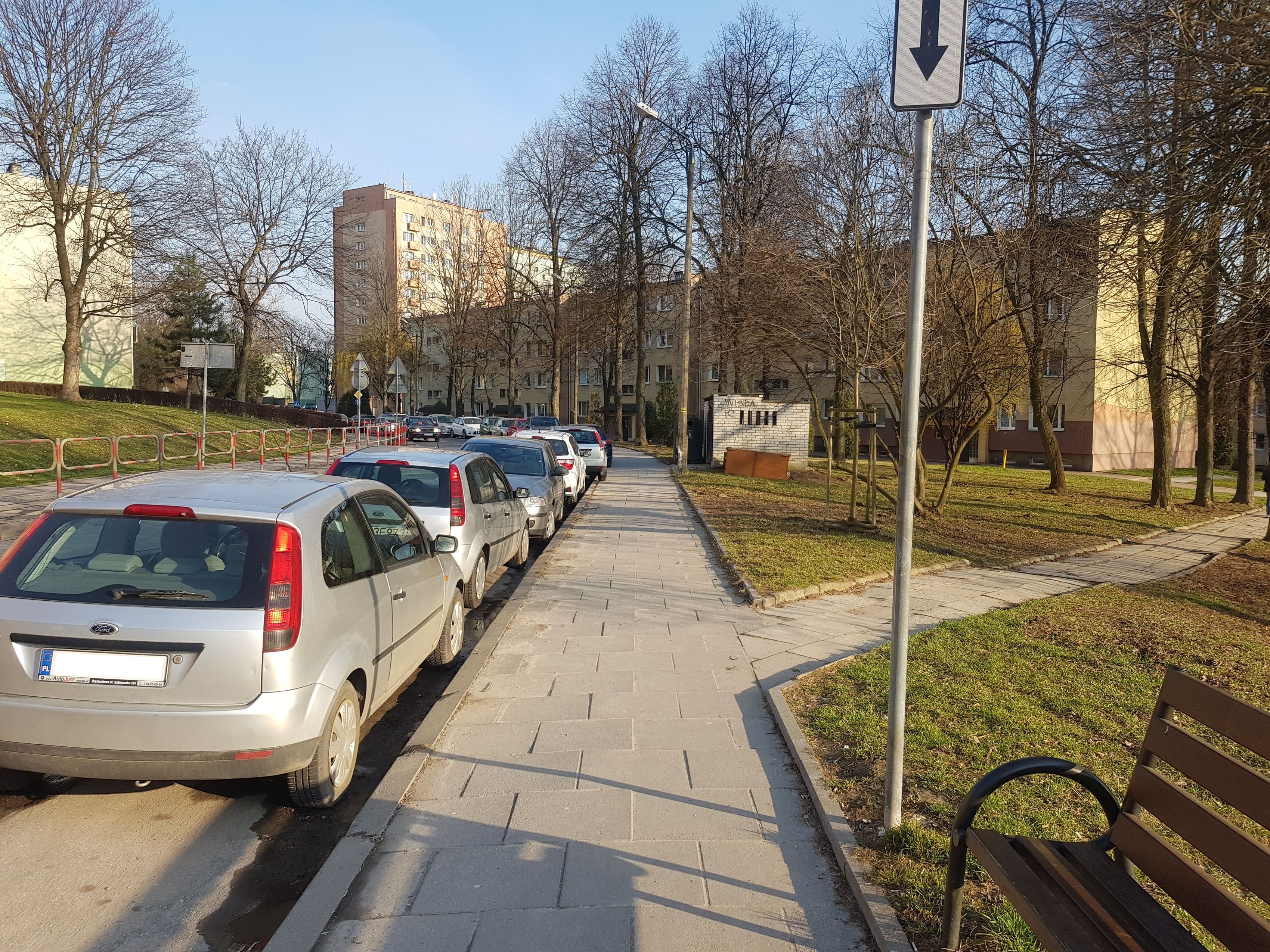 Projekt zadania zakłada wybudowanie miejsc postojowych w miejscu istniejącego chodnika na wysokości bloku nr 13 przy ul. Architektów. Szerokość chodnika w tym miejscu wynosi 2 m (nie wliczając krawężnika i obrzeża).