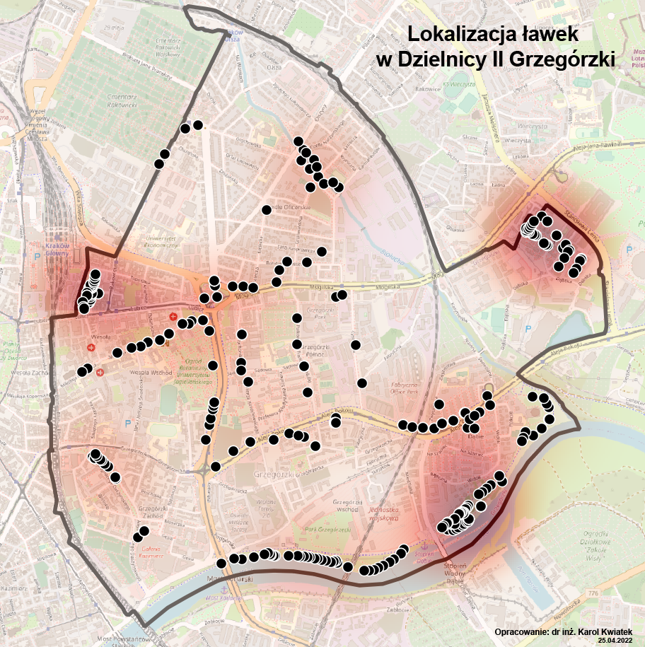 Autor projektu przeprowadził inwentaryzację ławek w Dzielnicy II Grzegórzki. Została wykonana mapa w oprogramowaniu QGIS.